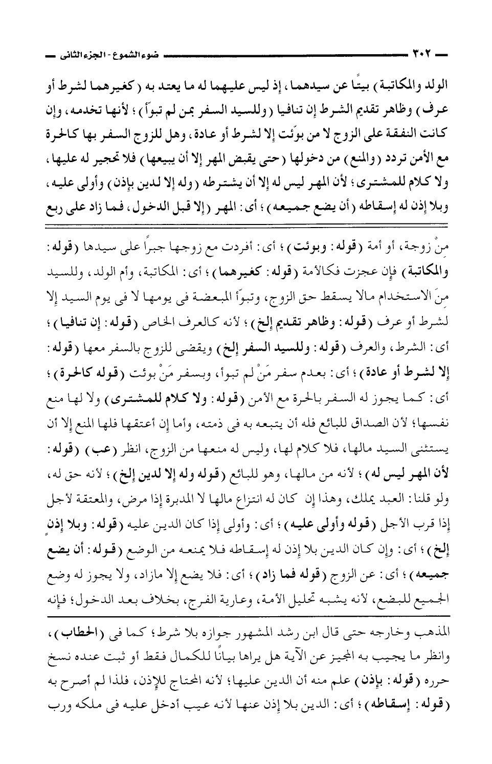 المذهب وخارجه حتى قال ابن رشد جوازه بلا شرط، كما فى (الحطاب)، وانظر ما يجيب به المحيز عن الأىة هل يراها بيانًا للكمال فقط أو ثبت عنده نسخ حرره (قوله: بإذن) علم منه أن الدين عليها، لأنه المحتاج للإذن، فلذا لم أصرح به (قوله: إسقاطه)، أى: الدين بلا إذن عنها لأنه عيب أدخل عليه فى ملكه ورب
