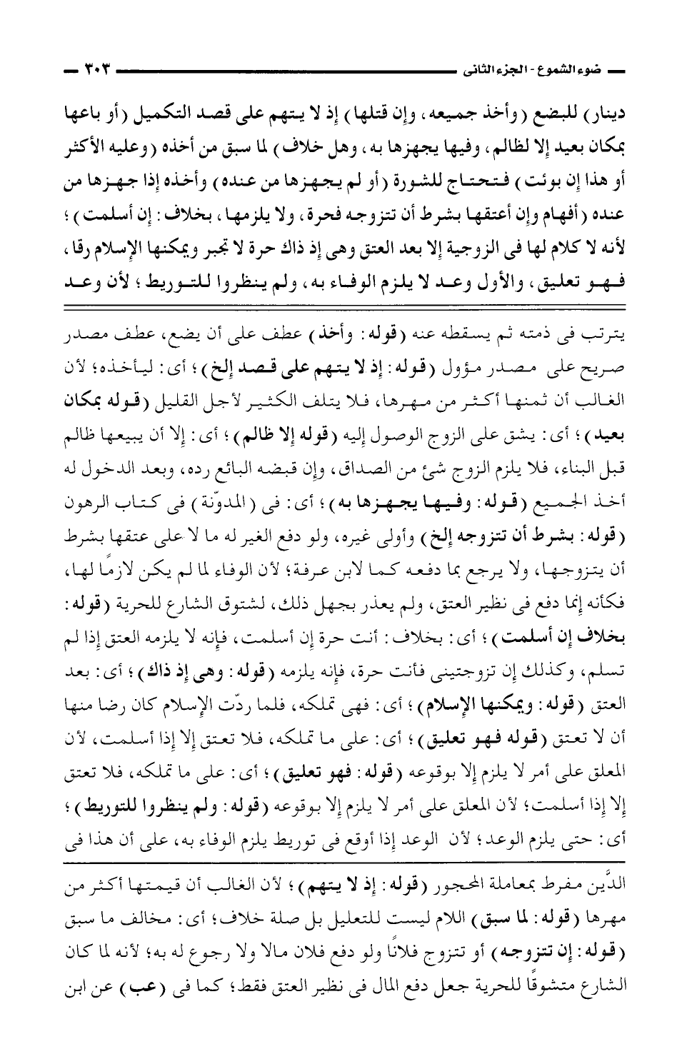 الدَّين مفرط بمعاملة المحجور (قوله: إذ لا يتهم)، لأن الغالب أن قيمتها أكثر من مهرها (قوله: لما سبق) للام ليست للتعليل بل صلة خلاف، أى: مخالف ما سبق (قوله: إن تتزوجه) أو تتزوج فلانًا ولو دفع مالا ولا رجوع له به، لأن لما كان الشارع متشوقًا للحرية جعل دفع المالك فى نظير العتق فقط، كما فى (عب) عن أبى
