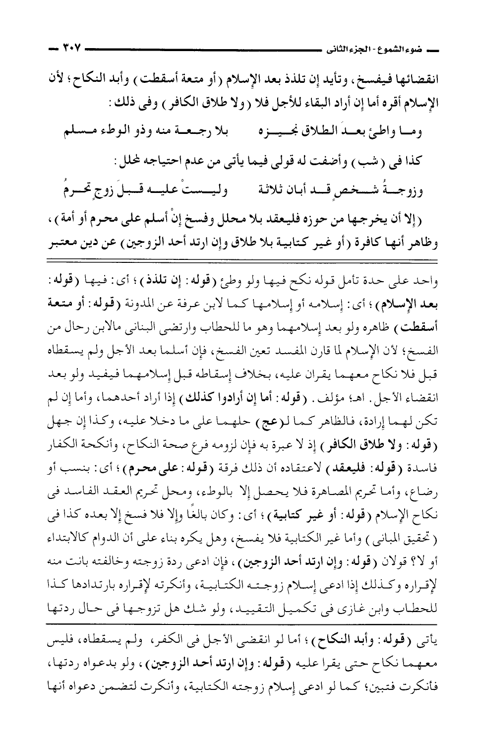 واحد على حدة تأمل قوله نكح فيها ولو وطئ (قوله: إِن تلذ)، أى: فيها (قوله: بعد الإسلام)، أى إِسلامها كما لابن عرفة عن المدونة (قوله: أو متعة أسقطت) ظاهره ولو بعد إسلامهما وهو ما للحطاب وارتضى البنانى ملابن رحال من الفسخ، لأن الإسلام لما قارن المفسد تعين الفسخ، فإِن أسلما بعد الأجل ولم يسقطاه قبل فلا نكاح معها يقران عليه، بخلاف إِسقاطه قبل إسلامهما فيفيد ولو بعد انقضاء الأجل. اهـ، مؤلف. (قوله: أما إِن أرادوا كذلك) إِذا أراد أحداهما، وأما إن لم تكن لهما إِرادة، فالظاهر كما لـ (عج) حلهما على ما دخلا عليه، وكذا إن جهل (قوله: ولا طلاق الكافر) إذ لا عبرة به فإِن لزومه فرع صحة النكاح، وأنكحة الكفار فاسدة (قوله: فليعقد) لاعتقاده أن ذلك فرقة (قوله: على محرم)، أى: بنسب أو رضاع، وأما تحريم المصاهرة فلا يحصل إِلا بالوطء، ومحل تحريم العقد الفاسد فى نكاح الإسلام (قوله: أو غير كتابية)، أى: وكان بالغًا وإِلا فلا فسخ إِلا بعده كذا فى (تحقيق المبانى) وأما غير الكتابية فلا يفسخ، وهل يكره بناء على أن الدوام كالابتداء وأولا؟ قولان (قوله: وإِن ارتد أحد الزوجين)، فإِن ادعى ردة زوجته وخالفته بانت منه لإقراره وكذلك إِذا ادعى إسلام زوجته الكتابية، وأنكرته لإقراره بارتدادها كذا للحطاب وابن غازى فى تكميل التقييد، ولو شك هل تزوجها فى حال ردتها