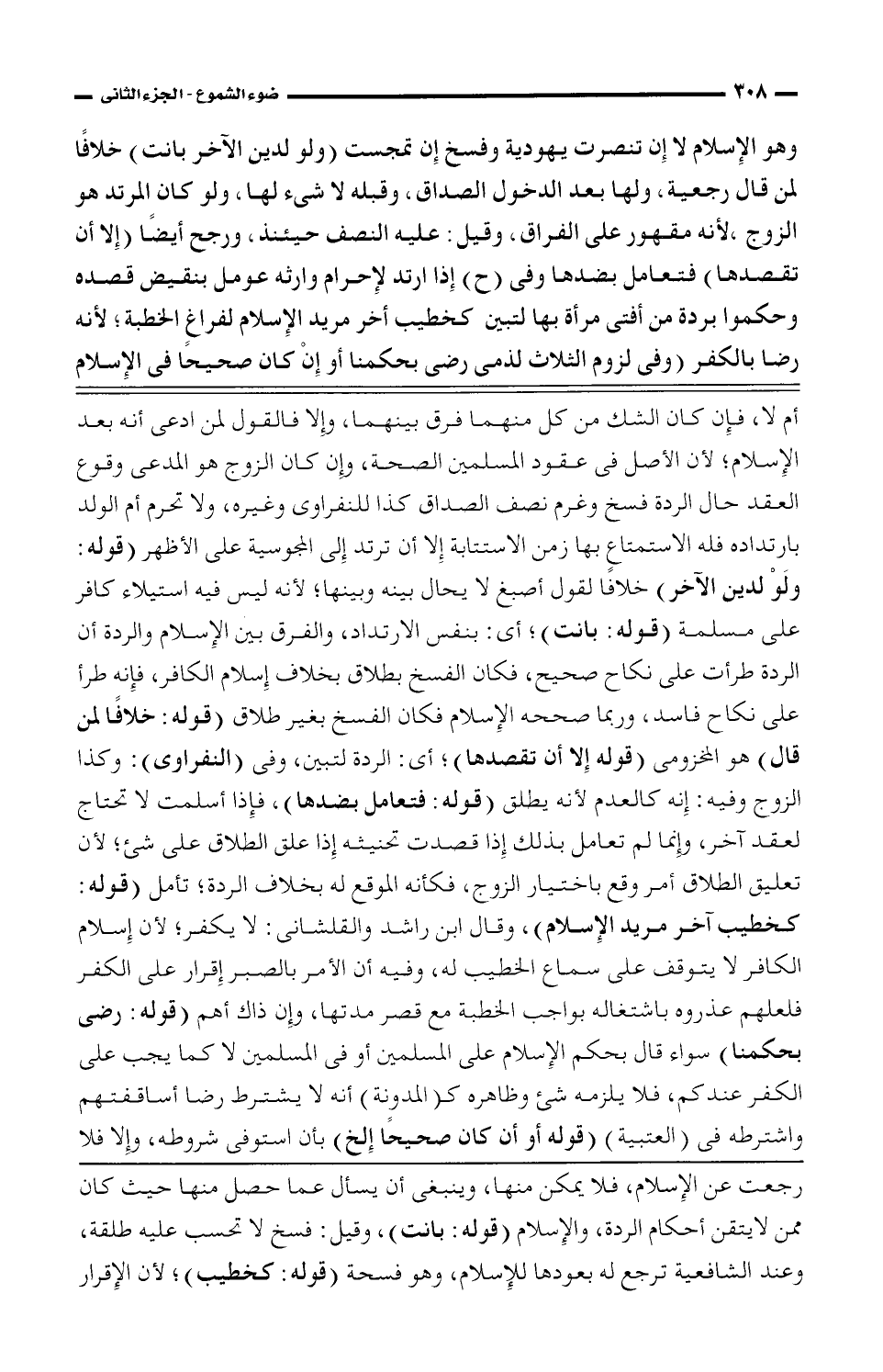 وهو الإسلام لا إن تنصرت يهودية وفسخ إن تمجست (ولو لدين الآخر بانت) خلافًا لمن قال رجعية، ولها بعد الدخول الصداق، وقبله لا شئ لها، ولو كان المرتد هو الزوج، لأنه مقهور على الفراق، وقيل: عليه النصف حينئذ، ورجح أيضًا (إلا أن تقصدها) فتعامل بضدها وفى (ح) إذا ارتدته عوامل بنقيض قصده وحكموا بردة من أفتى مرأة بها لتبين كخطيب أخر مريد الإسلام لفراغٍ الخطبة، لأنه رضا بالكفر (وفى لزوم الثلاث لذمى رض بحمنا أو إن كان صحيحًا فى الإسلام