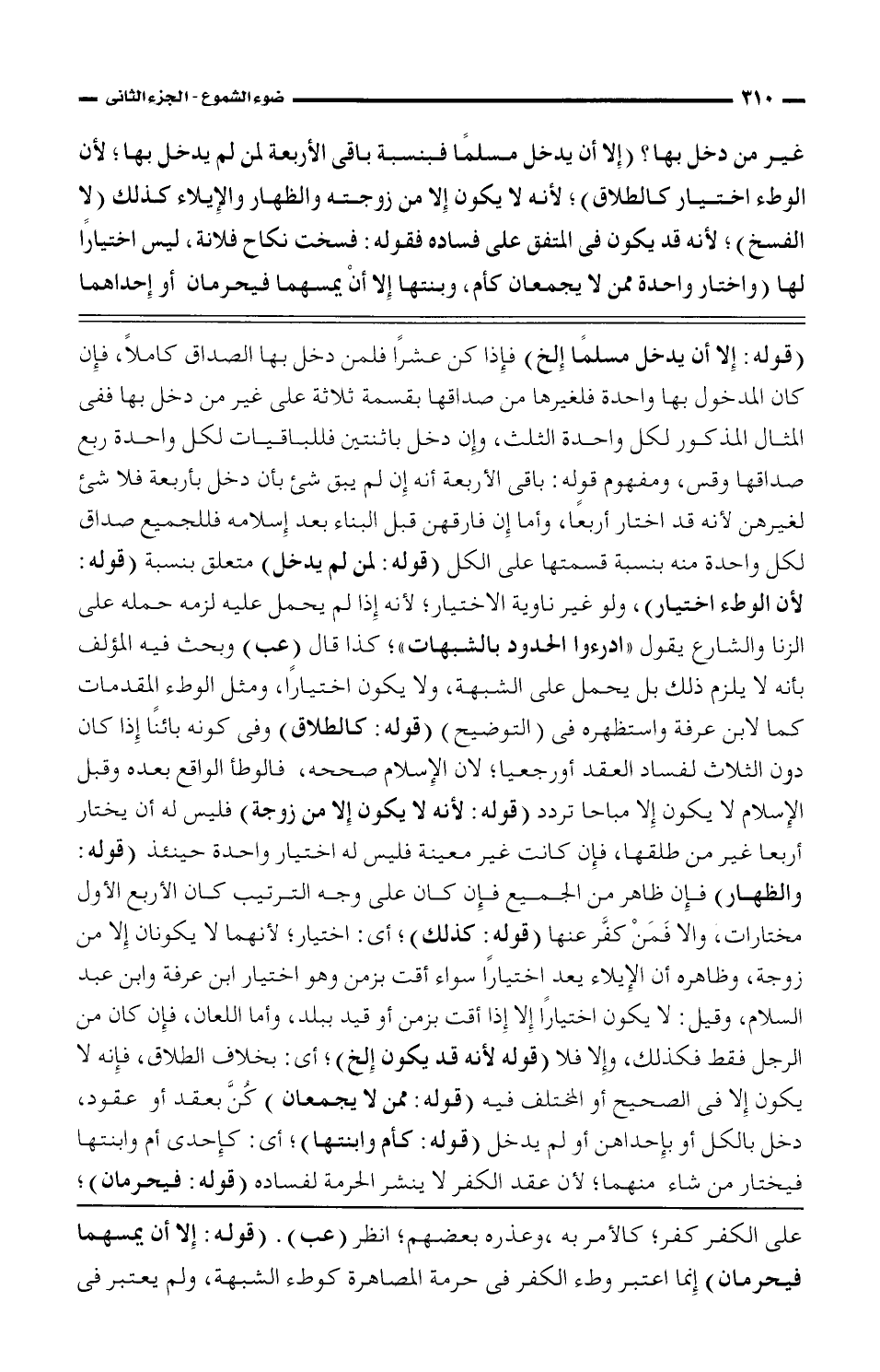 غير من دخل بها؟ (إلا أن يدخل مسلمًا فبنسبة باقى الاربعة لمن لم يدخل بها، لأن الوطء اختيار كالطلاق)، لانه لا يكون إلا من زوجته والظهار والأىلاء كذلك (لا الفسخ)، لأنه قد يكون فى المتفق على فاساده فقوله: فسخت نكاح فلانة، ليس اختيارًا لها (واختار واحدة ممن لا يجمعان كأم، وبينها إلا أن يمسهما فيحرمان أو إحداهما