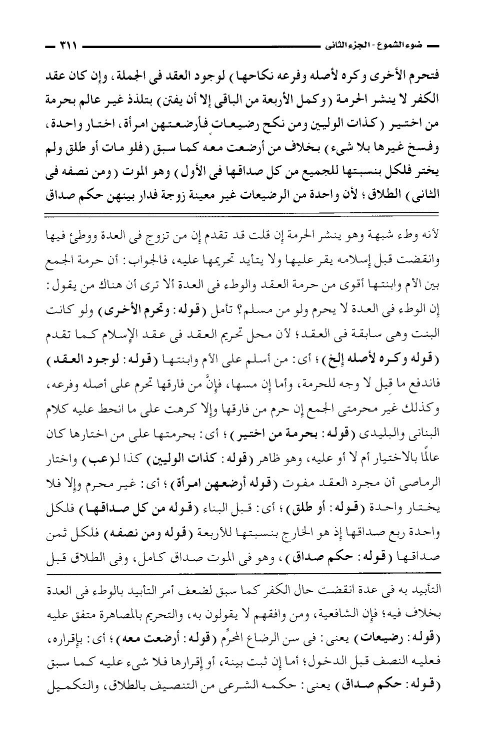 لأنه وطء شبهة وهو ينشر الحرمة إن قلت قد تقدم إن من تقدم أن من تزوج فى العدة وطئ فيها وانقضيت قبل إسلامه يقر عليها ولا يتأىد تحريمها عليه، فالجواب: أن حرمة الجمع بين الأم وابنتها أقوى من حرمة والوطء فى العدة ألا ترى أن هناك من نقول: إن الوطء فى العدة لا يحرم ولو من مسلم؟ تأمل (قوله: وتحرم الأخرى) ولو كانت البنت وهى سابقة فى العقد، لأن محل تحريم العقد فى عقد الإسلام كما تقدم (قوله: وكره لأصله إلخ)، أى: من أسلم على الأم وابنتها (قوله: لوجود العقد) فاندفع ما قيل لا وجه للحرمة، وأما إنّ فارقها تحرم على أصله وفروعه، وكذلك غير محترمتى الجمع إن حرم من فارقها وإلا كرهت على ما انحط عليه كلام البنانى والبليدى (قوله: بحرمته من اختير)، أى: بحرمتها على من اختيارها كان عالمًا بالأختيار أم أو عليه، وهو ظاهر (قوله: كذات الوليين) كذا لـ (عب) واختار الرماصى أن مجرد العقد مفوت (قوله: أرضعهن امرأة)، أى: غير محرم وإلا فلا يختار واحدة (قوله: أو طلق)، أى: قبل البناء (قوله من كل صداقتها) فلكل واحدة ربع صداقها إذ هو الخارج بنسبتها للأربة (قوله ومن نصفه) فلكل ثمن صداقها (قوله: حكم صداق)، وهو فى الموت صداق كامل، وفى الطلاق قبل