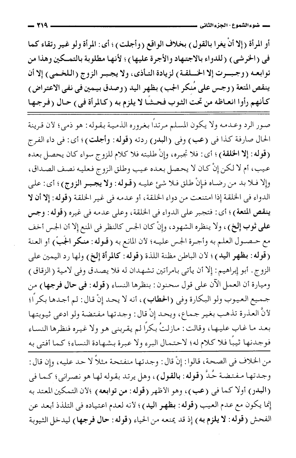 صور الرد وعدمه ولا يكون المسلم مرتداً بغروره الذمية بقوله: هو ذمي؛ لأن قرينة الحال صارفة كذا في (عب) وفي (البدر) ردته: (قوله: وأجلت)؛ أى: في داء الفرج (قوله: إلا الخلقة)؛ أى: فلا تجبره، وإن طلبته فلا كلام للزوج سواء كان يحصل بعده عيب، أم لا لكن إن كان لا يحصل بعده عيب وطلق الزوج فعليه نصف الصداق، وإلا فلا بد من رضاه فإن طلق فلا شئ عليه (قوله: ولا يجبر الزوج)؛ أى: علي الدواء في الخلقة إذا امتنعت من دواء الخلقة، او عدمه في غير الخلقه (قوله: إلا أن لا ينقص المتعة)؛ أى: فتجبر علي الدواء في الخلقة، وعلي عدمه في غيره (قوله: وجس علي ثوب إلخ)، ولا ينظره الشهود، وغن كان الجس كالنظر في المنع إلا أن الجس تخف من حصول العلم به وأجرة الجس عليه؛ لن المانع به (قوله: منكر الحب) أو العنة (قوله: بظهر اليد)؛ لان الباطن مظنة اللذة (قوله: كالمرأة إلخ) ولها رد اليمين علي الزوج. أبو غبراهيم: إلا أن يأتي بإمراتين تشهدان له فلا يصدق وفي لامية (الزقاق) و (ميارة) أن العمل الآن علي قول سحنون: بنظرها النساء (قوله: في حال فرجها) من جميع العيوب ولو البكارة وفي (الحطاب)، انه لا يحد إن قال: لم أجدها بكراً؛ لأن العذرة تذهب بغير جماع، ويحد إن قال: وجدتها مفتضة ولو ادعي ثيوبتها بعد ما غاب عليها، وقالت: مازلت بكراً لم يقربني هو ولا غيره فنظرها النساء فوجدنها ثيباً فلا كلام له؛ لاحتمال البرء ولا عبرة بشهادة النساء؛ كما أفتي به