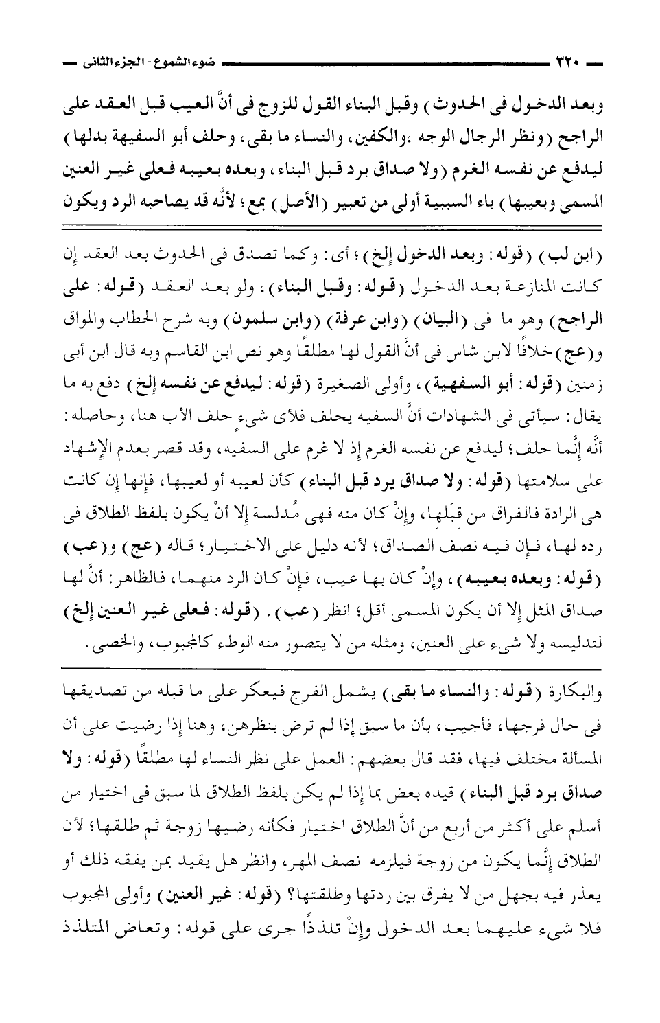 (ابن لب) (قوله: وبعد الدخول إلخ)؛ أى: وكما تصدق في الحدوث بعد العقد إن كانت المنازعة بعد الدخول (قوله: وقبل البناء)، ولو بعد العقد (قوله: على الراجح) وهو ما في (البيان) (وابن عرفة) (وابن سالمون) وبه شرح الحطاب والمواق و (عج) خلافًا لابن شاس في أن القول لها مطلقًا وهو نص ابن القاسم وبه قال ابن أبي زمنين (قوله: أبو السفيهة)، وأولى الصغيرة (قوله: ليدفع عن نفسه إلخ) دفع به ما يقال: سيأتي في الشهادات أن السفيه يحلف فلأى شئ حلف الأب هنا، وحاصله: أنه إنما حلف؛ ليدفع عن نفسه الغرم إذ لا غرم على السفيه، وقد قصر بعدم الإشهاد على سلامتها (قوله: ولا صداق يرد قبل البناء) كان لعيبه أو لعيبها، فإنها إن كانت هى الرادة فالفراق من قبلها، وإن كان منه فهى مدلسة إلا أن يكون بلفظ الطلاق في رده لها، فإن فيه نصف الصداق؛ لأنه دليل على الاختيار؛ قاله (عج) و (عب) (قوله: وبعده بعيبه)، وإن كان بها عيب، فإن كان الرد منهما، فالظاهر: أن لها صداق المثل إلا أن يكون المسمى أقل؛ انظر (عب). (قوله: فعلى غير العنين إلخ) لتدليسه ولا شئ على العنين، ومثله من لا يتصور منه الوطء كالمجبوب، والخصى.