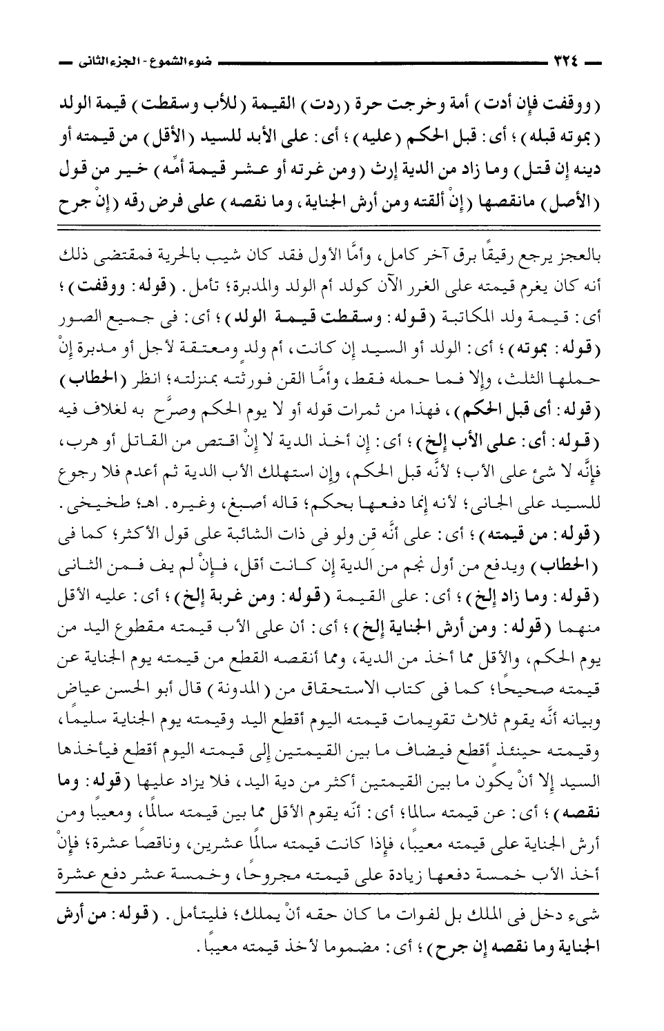 بالعجز يرجع رقيقًا برق آخر كامل، وأما الأول فقد كان شيب بالحرية فمقتضى ذلك أنه كان يغرم قيمته على الغرر الآن كولد أم الولد والمدبرة؛ تأمل. (قوله: ووقفت)؛ أى: قيمة ولد المكاتبة (قوله: وسقطت قيمة الولد)؛ أى: في جميع الصور (قوله: بموته)؛ أى: الولد أو السيد إن كانت، أم ولد ومعتقة لأجل أو مدبرة إن حملها الثلث، وإلا فما حمله فقط، وأما القن فورثته بمنزلته؛ انظر (الحطاب) (قوله: أى قبل الحكم)، فهذا من ثمرات قوله أو لا يوم الحكم وصرح به لغلاف فيه (قوله: أى: على الأب إلخ)؛ أى: إن أخذ الدية لا إن اقتص من القاتل أو هرب، فإنه لا شئ على الأب؛ لأنه قبل الحكم، وإن استهلك الظاب الدية ثم أعدم فلا رجوع للسيد على الجانى؛ لأنه إنما دفعها بحكم؛ قاله أصبغ، وغيره. اهـ؛ طخيخى. (قوله: من قيمته)؛ أى: على أنه قن ولو في ذات الشائبة على قول الاكثر؛ كما فى (الحطاب) ويدفع من أول نجم من الدية إن كانت أقل، فإن لم يف فمن الثانى (قوله: وما زاد إلخ)؛ أى: على القيمة (قوله: ومن غربة إلخ)؛ أى: عليه الأقل منهما (قوله: ومن أرش الجنأىة إلخ)؛ أى: أن على الأب قيمته مقطوع اليد من يوم الحكم، والأقل مما أخذ من الدية، ومما أنقصه القطع من قيمته يوم الجنأىة عن قيمته صحيحًا؛ كما في كتاب الاستحقاق من (المدونة) قال أبو الحسن عياض وبيانه أنه يقوم ثلا تقويمات قيمته اليوم أقطع اليد وقيمته يوم الجنأىة سليمًا، وقيمته حينئذ أقطع فيضاف ما بين القيمتين إلى قيمته اليوم أقطع فيأخذها السيد إلا أن يكون ما بين القيمتين أكثر من دية اليد، فلا يزاد عليها (قوله: وما نقصه)؛ أى: عن قيمته معيبًا، فإذا كانت قيمته سالمًا عشرين، وناقصًا عشرة؛ فإن أخذ الأب خمسة دفعها زيادة على قيمته مجروحًا، وخمسة عشر دفع عشرة