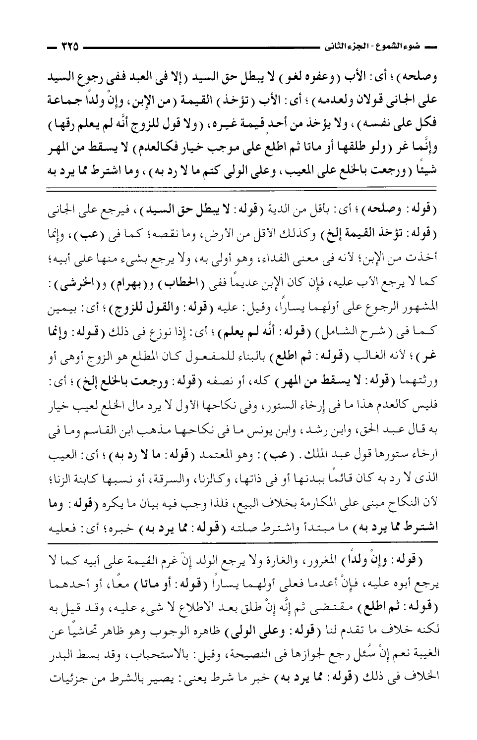 (قوله: وصلحه)؛ أى: بأقل من الدية (قوله: لا يبطل حق السيد)، فيرجع علي الجاني (قوله: تؤخذ القيمة إلخ) وكذلك الاقل من الأرض، وما نقصه؛ كما في (عب)، وإنما أخذت من الإبن؛ لأنه في معني الفداء، وهو أولى به، ولا يرجع بشئ منها علي أبيه؛ كما لا يرجع الأب عليه، فإن كان الإبن عديمًا ففي (الحطاب) و (بهرام) و (الخرشى): المشهور الرجوع علي أولهما يسارًا، وقيل: عليه (قوله: والقول للزوج)؛ أى: بيمين كما في (شرح الشامل) (قوله: أنه لم يعلم)؛ أى: إذا نوزع في ذلك (قوله: وإنما غر)؛ لأنه الغالب (قوله: ثم اطلع) بالبناء للمفعول كان المطلع هو الزوج أو هي أو ورثتهما (قوله: لا يسقط من المهر) كله، أو نصفه (قوله: ورجعت بالخلع إلخ)؛ أى: فليس كالعدم هذا ما في إرخاء الستور، وفي نكاحها الأول لا يرد مال الخلع لعيب خيار به قال عبد الحق، وابن رشد، وابن يونس ما في نكاحها مذهب ابن القاسم وما في إرخاء ستورها قول عبد الملك. (عب): وهو المعتمد (قوله: ما لا رد به)؛ أى: العيب الذي لا رد به كان قائمًا ببدنها أو في ذاتها، وكالزنا، والسرقة، أو نسبها كابنة الزنا؛ لأن النكاح مبنى على المكارمة بخلاف البيع، فلذا وجب فيه بيان ما يكره (قوله: وما اشترط مما يرد به) ما مبتدأ واشترط صلته (قوله: مما يرد به) خيره؛ أى: فعليه