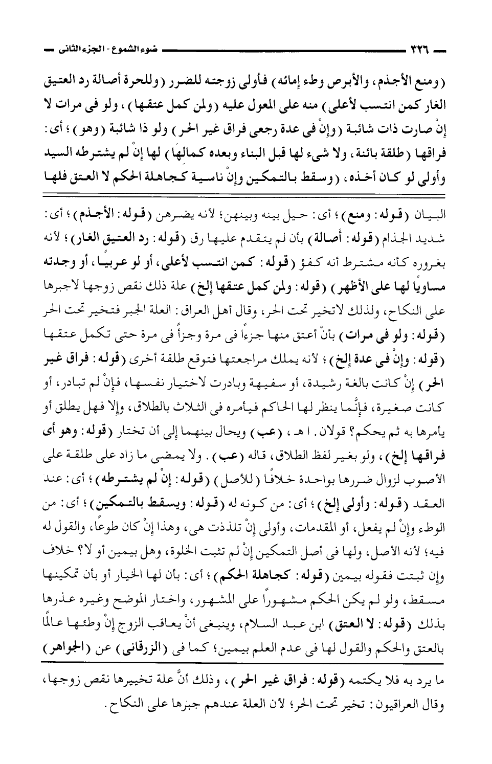 البيان (قوله: ومنع)، أى: حيل بينه وبينهن، لأنه يضرهن (قوله: الأجذم)، أى: شديد الجذام (قوله: أصالة) بأن لم يتقدم عليها رق (قوله: رد العتيقٍ الغار)، لأنه بغرورهٍ كأنه مشترط أنه كفؤ (قوله: كمن انتسب لأعلى. أو لو عربيًا، أو وجدته مساويًا لها على الأظهر) (قوله: ولمن كمل عتقها إلخ) علة ذلك نقص زوجها لا جبرها على النكاح، ولذلك لا تخير تحت الحر، وقال أهل العراق: العلة الجبر فتخير تحت الحر (قوله: ولو فى مرات) بأن أعتق منها جزءًا فى مرة وجزءًا فى مرة حتى تكمل عتقها (قوله: وإن فى عدة إلخ)، لأنه يملك مراجعتها فتوقع طلقة أخرى (قوله: فراق غير الحر) إن كانت بالغة رشيدة، أو سفيهة وبادرت لاختيار نفسها، فإِن لم تبادر، أو كانت صغيرة، فإِنّما ينظر لها الحاكم فيأمره فى الثلاث بالطلاق، وإلا فهل يطلق أو يأمرها به ثم يحكم؟ قولان. اهـ، (عب) ويحال بينهما إلى أن تختار (قوله: وهو أى فراقها إلخ)، ولو بغير لفظ الطلاق، قاله (عب). ولا يمضى ما زاد على طلقة على الأصوب لزوال ضررها بواحدة خلافًا (للأصل) (قولة: إن لم يشترطه)، أى: عند العقد (قوله: وأولى إِلخ)، أى: من كونه له (قوله: ويسقط بالتمكين)، أى: من الوطء وإِن لم يفعل، أو المقدمات، وأولى إِن تلذت هى، وهذا إِن كان طوعًا، والقول له فيه، لأنه الأصل، ولها فى أصل التمكين إِن لم تثبت الخلوة، وهل بيمين أو لا؟ خلاف وإِن ثبتت فقوله بيمين (قوله: كجاهلة الحكم)، أى: بأن لها الخيار أو بأن تمكينها مسقط، ولو لم يكن الحكم مشهورًا على المشهور، واختار الموضح وغيره عذرها بذلك (قوله: لا العتق) ابن عبد السلام، وينبغى أن يعاقب الزوج إِن وطئها عالمًا بالعتق والحكم والقول لها فى عدم العلم بيمين، كما فى (الزوقانى) عن (الجوهر)
