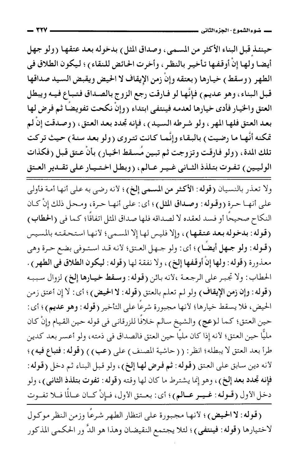 ولا تعذر بالنسيان (قوله: الاكثر من المسمى إِلخ)، لأنه رض به على أنها أمة فأولى على أنها حرة (وقوله: وصداق المثل)، أى: على أنها حرة، ومحل ذلك إِن كان النكاح صحيحًا أو لعقده لعقده لا لصداقه فلها صداق المثل اتفقًا، كما فى (الحطاب) (وقوله: بدخوله بعد عتقها)، وإلا فليس لها المسمى، لأنها استحقته بالمسيس (قوله: ولو جهل أيضًا)، أى: ولو جهل العتق، لأنه قد استوفى بضع حرة وهى معذورة (قوله: ولها إِن اوقفها إِلخ)، ولا نفقه لها (قوله: ليكون الطلاق فى الطهر).