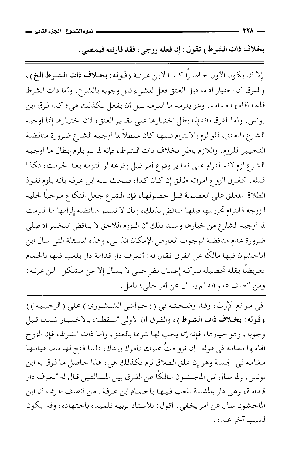 فى موانع الإِرث، وقد وضحته فى ((حواشى الشنشورى) على (الرحبية)) (قوله: بخلاف ذات الشرط)، والفرق أن الأولى أسقطت بالاختيار شيئا قبل وجوبه، وهو خيارها، فإنه إِنما يجب لها شرعا بالعتق، وأما ذات الشرط، فإِن الزوج أقامها مقامه فى قولة: إِن تزوجتُ عليك فأمرك بيدك، فلما فتح لها باب قيامها مقامها مقامه فى الجملة وهو إِن علق الطلاق لزم فكذلك هى، هذا حاصل ما فرق به ابن يونس، ولما سأل ابن الماجشون مالكًا عن الفرق بين المسألتين قال له أتعرف دار قدامة، وهى دار بالمدينة يلعب فيها بالحمام ابن عرفة: من أنصف عرف أن ابن الماجشون سأل عن أمر يخفنى. أقول: للأستاذ تربية تلميذه باجتهاده، وقد لسبب آخر عنده.