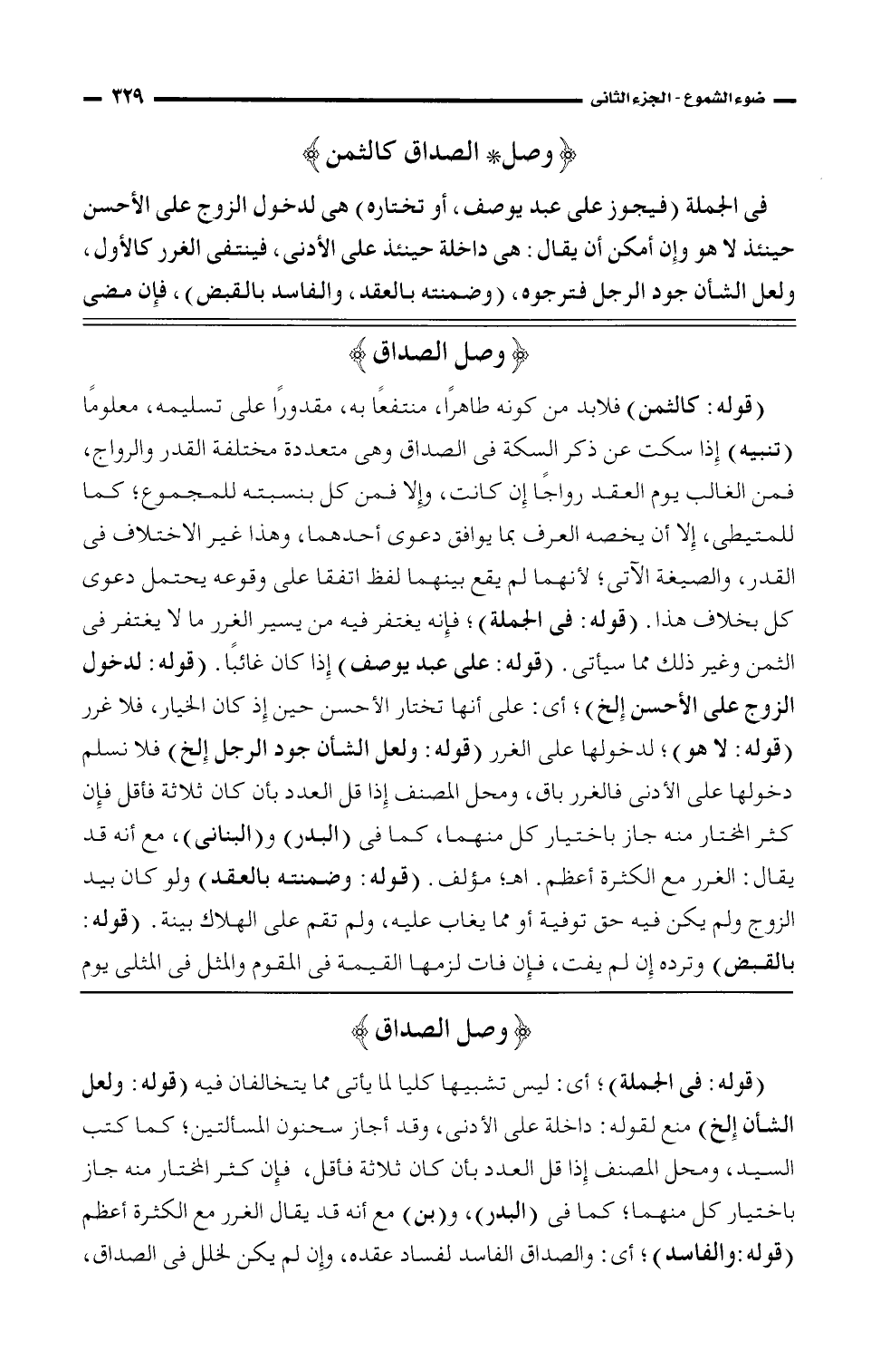 (قوله: فى الجملة)، أى: ليس تشبيها كليا لما يأتى مما يتخلفان فيه (قوله: ولعل الشأن إِلخ) منع لقوله: داخلة على الأدنى، وقد أجاز سحنون المسألتين، كما كتب السيد، ومحل المصنف إذا قل العدد بأن كان ثلاثة فأقل، فإن كثر المختار منه جاز باختيار كل منهما، كما فى (البدر)، و (بن) مع أنه قد يقال الغرر مع الكثرة أعظم (قوله: والفاسد)، أى: والصداق الفاسد عقده، وإِن لم يكن لخلل فى الصداق،