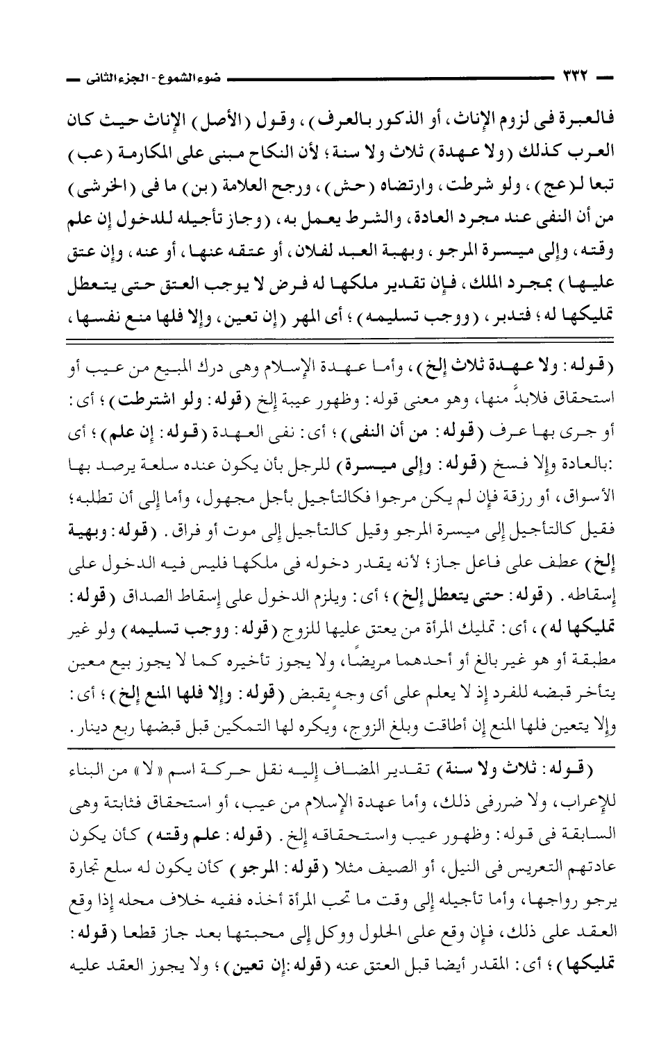 (قوله: ثلاث ولا سنة) تقدير المضاف إليه نقل حركة اسم ((لا)) من البناء للإعراب، ولا ضرر فى ذلك، وأما عهدة الأسلام من عيب، أو استحقاق فثابة وهى السابقة فى قوله: وظهور عيب واستحاقه إلخ. (قوله: علم وقته) كأن يكون عادتهم التعريس فى النيل، أو الصيف مثلا (قوله: المرجو) كأن له سلع تجارة يرجو رواجها، وأما تأجيله إلى وقت ما تحب المرأة أخذه فيه خلاف محله إذا وقع العقد على ذلك، فإن وقع على الحلول إلى محبتها بعد جاز قطعا (قوله: تمليكها)، أى المقدر أىضا قبل العتق عنه (قوله: إن تعين)، ولا يجوز العقد عليه