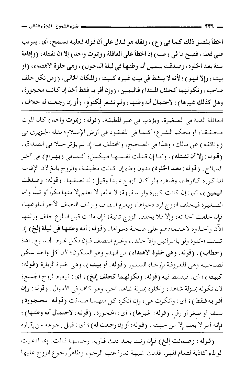 الخطأ بلصق ذلك كما فى (ح)، ونقله هو فدل على أن قوله فعليه تسمح، أى: يترتب على فعله، فصح ما فى (عب) إِذا الخطأ على العاقلة (وبموت واحد) إِلا أن تقتله، (وإقامة سنة بعد الخلوة، وصدقت بيمين أنه وطئها فى ليلة الدخول)، وهى خلوة الاهتداء، (أو بيته، وإلا فهو) لأنه لا ينشط فى بيت غيره كبيته، والمكان الخالى، (ومن نكل حلف صاحبه، ونكولهما كحلف المبتدا) فاليمين، (وإِن أقر به فقط أخذ إن كانت محجورة، وهل كذلك غيرها)، لاحتمال أنه وطئها، ولم تشعر لكنومٍ، (أو إن رجعت له خلاف،