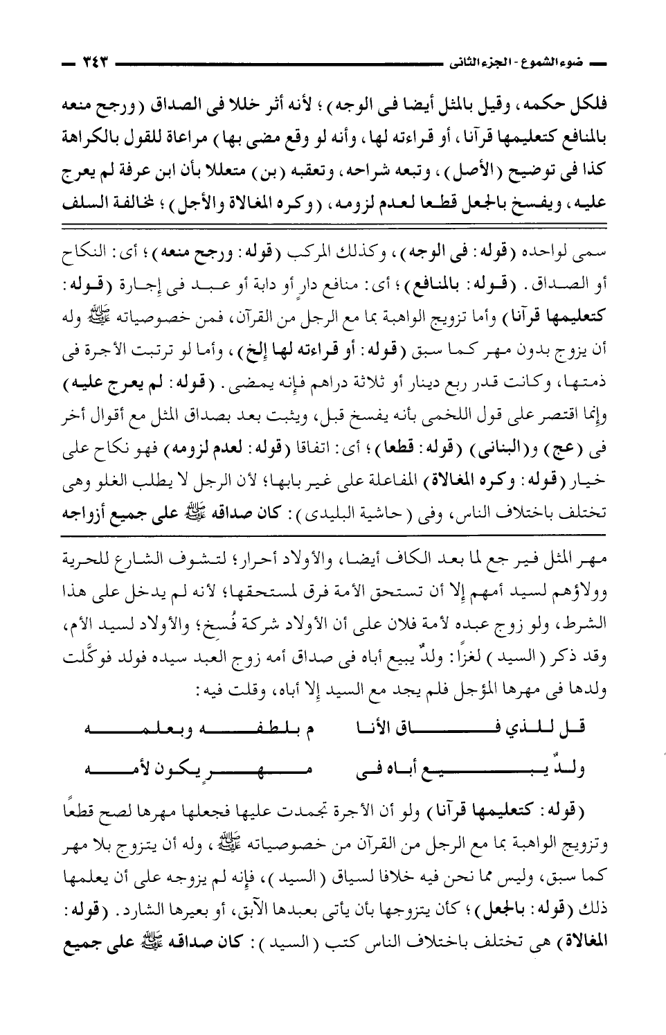 مهر المثل فيرجع لما بعد الكاف أيضًا، والأولاد أحرار، لتشوف الشارع للحرية وولاؤهم لسيد أمهم "إِلا أن تستحق الأمة فرق لمستحقها، لأنه لم يدخل على هذا الشرط، ولو زوج عبده لأمة فلان على أن الأولاد شركة فُسِخ، والأولاد السيد الأم، وقد ذكر (السيد) لغزًا: ولدْ يبيع أباه فى صداق أمه زوج العبد سيده فولد فوكْلت ولدها فى مهرها المؤجل فلم يجد مع السيد إِلا أباه، وقلت فيه: