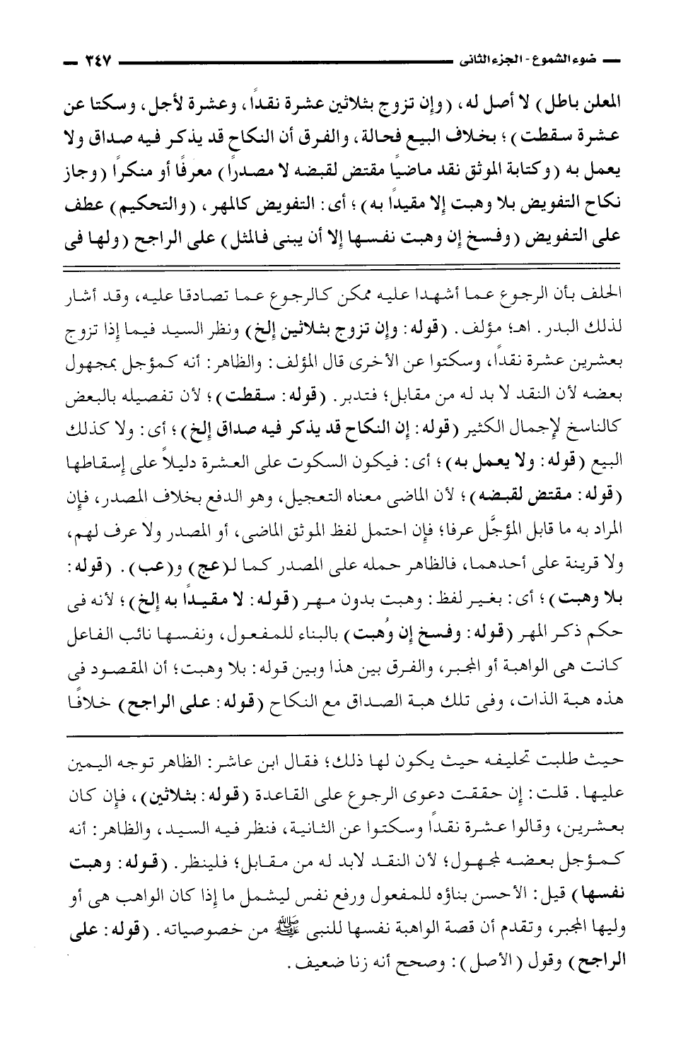 المعلن باطل) لا أصل له، (وإِن تزوج بثلاثين عشرة نقدًا، وعشرة لأجل، وسكتا عن عشرة سقطت)، بخلاف البيع فحالة، والفرق أن النكاح قد يذكر فيه صداق ولا يعمل به (وكتابة الموثق نقد ماضيًا مقتض لقبضه لا مصدرًا) معرفًا أو منكرًا (وجاز نكاح التفويض بلا وهبت إِلا مقيًا به)، أى: التفويض كالمهر، (والتحكيم) عطف على التفويض (وفسخ إِن وهبت نفسها إِلا أن يبنى فالمثل) على الراجح (ولها فى