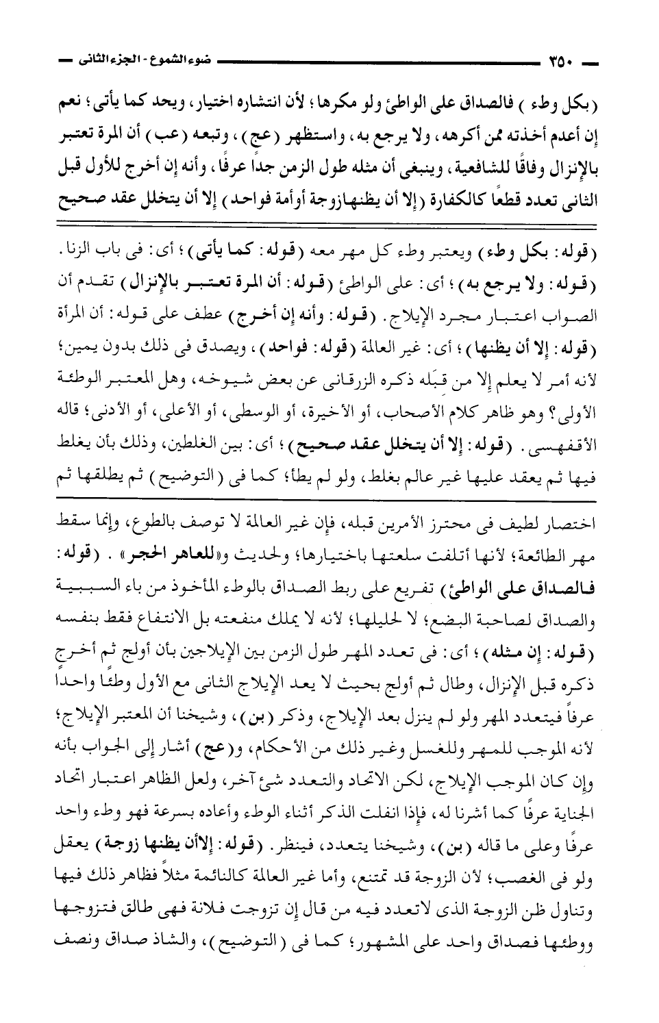 اختصار لطيف فى محترز الأمرين قبله، فإِن غير العالمة لا توصف بالطوع، وإنما سقط مهر الطائعة، لأنها أتلفت سلعتها باختيارها، ولحديث و (للعاهر الحجر). (قوله: فالصداق على الوطئ) تفريع على ربط الصداق بالوطء المأخوذ من باء السببية والصداق لصاحبة البضع، لا لحليلها، لأنه لا يملك منفعته بل الانتفاع فقط بنفسه (قوله: إِن مثله)، أى: فى تعدد المهر طول الزمن بين الأىلاجين بأن أولج ثم أخرج ذكره قبل الإِنزال، وطال ثم أولج بحيث لا يعد الإلاج الثانى مع الأول وطئًاواحدًا عرفًا فيتعدد المهر ولو لم ينزل بعد الأىلاج، وذكر (بن)، وشيخنا أن المعتبر الأىلاج، لأنه الموجب للمهر وللغسل وغير ذلك من الأحكام، و (عج) أشار إِلى الجواب بأنه وإِن كان الموجب الأىلاج، لكن الاتحاد والتعدد شئ آخر، ولعل الظاهر اعتبار اتحاد الجنأىة عرفًا كما أشرنا له، فإِذا انفلت الذكر أثناء الوطء وأعاده بسرعة فهو وطء واحد عرفًا وعلى ما قاله (بن)، وشيخنا يتعدد، فينظر. (قوله: إِلا أن يظنها زوجة) يعقل ولو فى الغصب، لأن الزوجة قد تمتنع، وأما غير العالمة كالنائمة مثلًا فظاهر ذلك فيها وتناول ظن الزوجة الذى لا تعدد فيه من قال إِن تزوجت فلانة فهى طالق فتزوجها ووطئها فصداق واحد على المشهور، كما فى (التوضيح)، والشاذ صداق ونصف