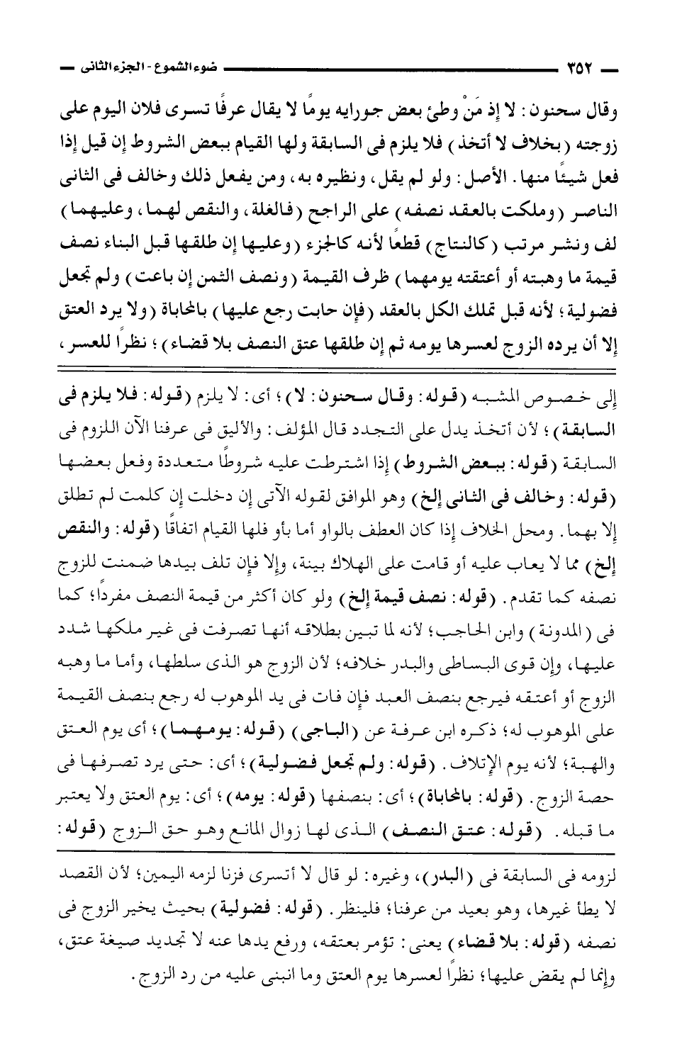 وقال سحنون: لا إِذ من وطئ بعض جوارأىه يومًا لا يقال عرفًا تسرى فلان اليوم على زوجته (بخلاف لا أتخذ) فلا يلزم فى السابقة ولها القيام ببعض الشروط إِن قيل إِذا فعل شيًا منها. الأصل: ولو لم يقل، ونظيره به، ومن يفعل ذلك وخالف فى الثانى الناصر (وملكت بالعقد نصفه) على الراحج (فالغلة، والنص لهما، وعليهما) لف ونشر مرتب (كالنتاج) قطعًا لأنه كالجزء (وعليها إن طلقها قبل البناء نصف قمتة ما وهبته أو أعتقه يومها) ظرف القيمة (ونصف الثمن إِن باعت) ولم تجعل فضولية، لأنه قبل تملك الكل بالعقد (فإِن حابت رجع عليها) بالمحاباة (ولا يرد العتق إلا أن يرده الزوج لعسرها يومه ثم إِن طلقها عتق النصف بلا قضاء)، نظرًا للعسر،
