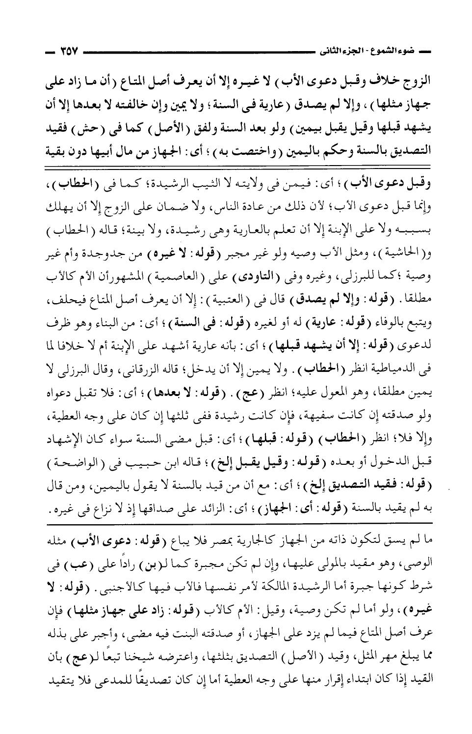 الزوج خلاف وقبل دعوى الاب) لاغيره إلا أن يعرف أصل المتاع (أن ما زاد على جهاز مثلها)، وإلا لم يصدق (عارية فى السنة، ولا يمين وإن خالفته لا بعدها إِلا أن يشهد قبلها وقيل يقبل بيمين) ولو بعد السنة، ولا يمين وإِن خالفته لا بعدها إِلا أن يشهد قبلها وقيل يقبل بيمين) ولو بعد السنة ولفق (الأصل) كما فى (حش) فقيد التصديق بالسنة وحكم باليمين (واختصت به)، أى: الجهاز من مال أبيها دون بقية