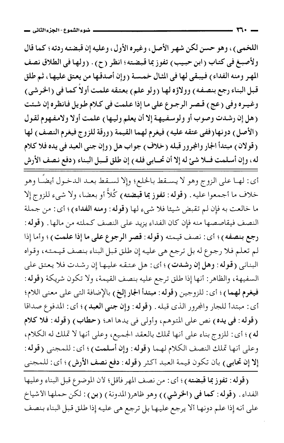 أى: لها على الزوج وهو لا يسقط بالخلع، وإلا لسقط بعد الدخول أيضًا وهو خلاف ما أجمعوا عليه. (قوله: تفوز بما قبضته) كُلًّا أو بعضا، ولا شئ للزوج إلا ما خالعت به فإن لم تقبض شيئا فلا شئ لها (قوله: ومنه الفداء)، أى: من جملة النصف فيقاصصها منه فإن كان الفداء يزيد على النصف كملته من مالها. (قوله: رجع بنصفه)، أى: نصف قيمته (قوله: قصر الرجوع على ما إذا علمت)، وإما إذا لم تعلم فلا رجوع له بل ترجع هى عليه إن طلق قبل البناء بنصف قيمته، وقواه البنانى (قوله: وهل إن رشدت)، أى: هل عتقه عليها إن رشدت فلا يعتق على السفيهة، والظاهر: أنها إذا طلق ترجع عليه بنصف القيمة، ولا تكون شريكة (قوله: فيغرم لهما)، أى: للزوجين (قوله: مبتدأ الجار إلخ) بالإضافة التى على معنى اللام، أى: مبتدأ للجار والمجرور الذى قبله. (قوله: وإن جنى العبا)، أى: المدفوع صداقا (قوله: فى يده) نص على المتوهم، وأولى فى يداها اهـ، (حطاب) (قوله: فلا كلام له)، أى: للزوج بناء على أنها تملك بالعقد الجميع، وعلى أنها لا تملك له الكلام، وعلى أنها تملك النصف الكلام لهما (قوله: وإن سلمت)، أى: للمجنى (قوله: إلا إن تحابى) بأن تكون قيمة العبد أكثر (قوله: دفع نصف الأرش)، أى: للمجنى