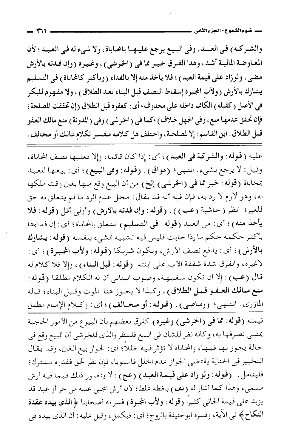 عليه (قوله: والشركة في العبد)؛ أى: إذا كان قائمًا، وإلا فعليها نصف المحاباة، وقيل: لا يرجع بشيء. انتهى؛ (مواق). (قوله: وفى البيع)؛ أى: بيعها للعبد بمحاباة (قوله: خير مما في (الخرشي) إلخ) من أن البيع وقع منها بغبن وقت ملكها له، وهو لازم لا رد به، فإن فيه أن قد يقال: محل عدم الرد ما لم يتعلق به حق للغير؛ انظر (حاشية (عب). (قوله: وإن فدته بالأرش) وأولى أقل (قوله: فلا يأخذ منه)؛ أى: من العبد (قوله: في التسليم) متعلق بالمحاباة؛ أى: إن فداءها بأكثر حكمه حكم ما إذا حابت فليس فيه تشبيه الشيء بنفسه (قوله: يشارك بالأرش)؛ أى: يدفع نصف الأرش، ويكون شريكًا (قوله: ولأب المجبرة)؛ أى: لا غيره، والفرق شدة شفقة الأب على ابنته (قوله: قبل البناء)، وإلا فلا كلام له قال (عب): إلا أن تكون سفيهة، وصوب البناني أن له الكلام مطلقًا (قوله: منع مالك العفو قبل الطلاق)، وكذا لا يجوز هنا الموت وقبل البناء؛ قاله المازري. انتهى؛ (رماصي). (قوله: أو مخالف)؛ أى: وكلام الإمام مطلق