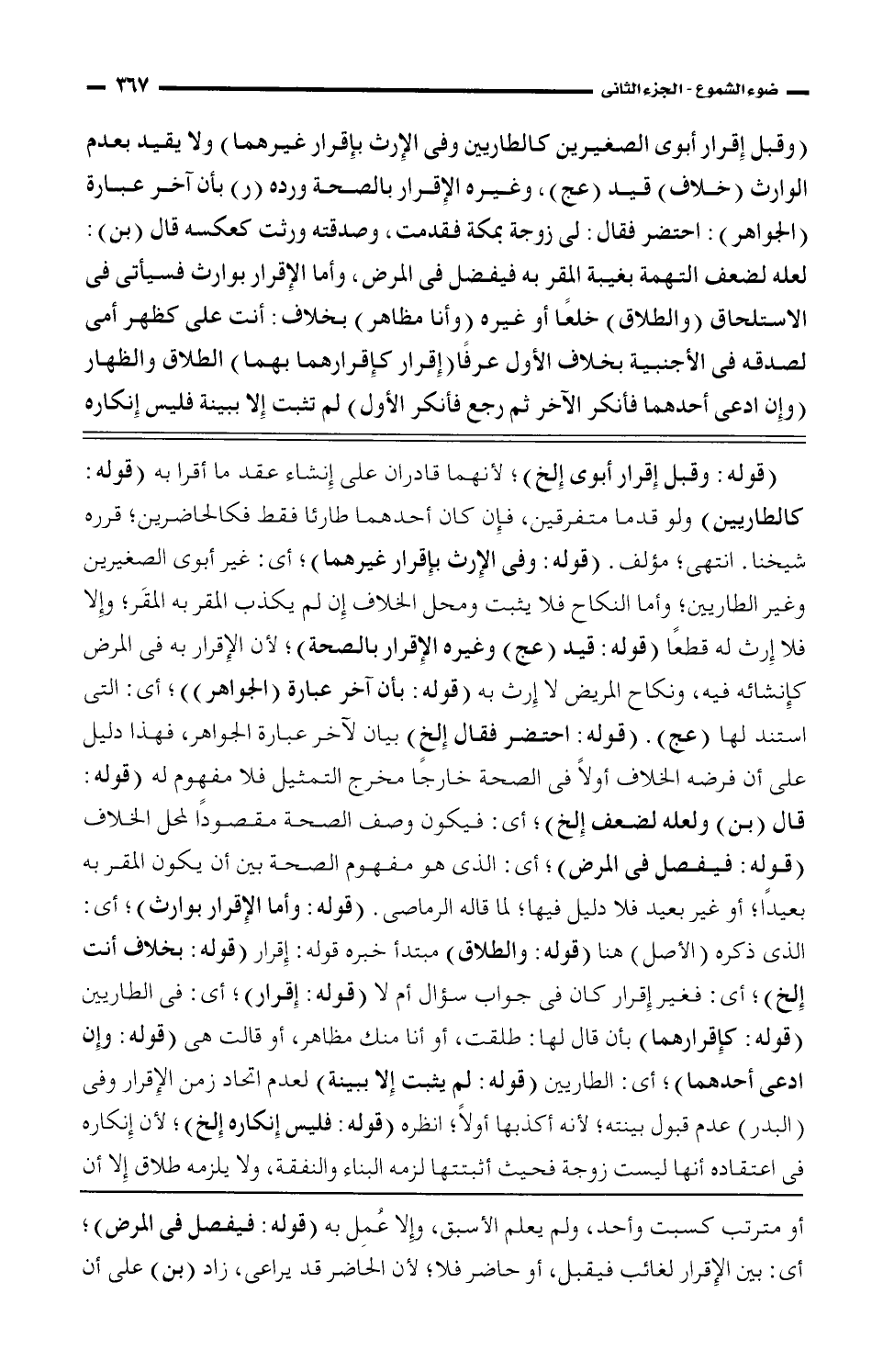 (وقبل إقرار أبوي الصغيرين كالطاريين وفي الإرث بإقرار غيرهما) ولا يقيد بعدم الوارث (خلاف) قيد (عج)، وغيره الإقرار بالصحة ورده (ر) بأن آخر عبارة (الجواهر): احتضر فقال: لي زوجة بمكة فقدمت، وصدقته ورثت كعكسه قال (بن): لعله لضعف التهمة بغيبة المقر به فيفضل في المرض، وأما الإقرار بوارث فسيأتي في الاستلحاق (والطلاق) خلعًا أو غيره (وأنا مظاهر) بخلاف: أنت علي كظهر أمي لصدقه في الأجنبية بخلاف الأول عرفًا (إقرار كإقرارهما بهما) الطلاق والظهار وإن ادعى أحدهما فأنكر الآخر ثم رجع فأنكر الأول) لم تثبت إلا ببينة فليس إنكاره