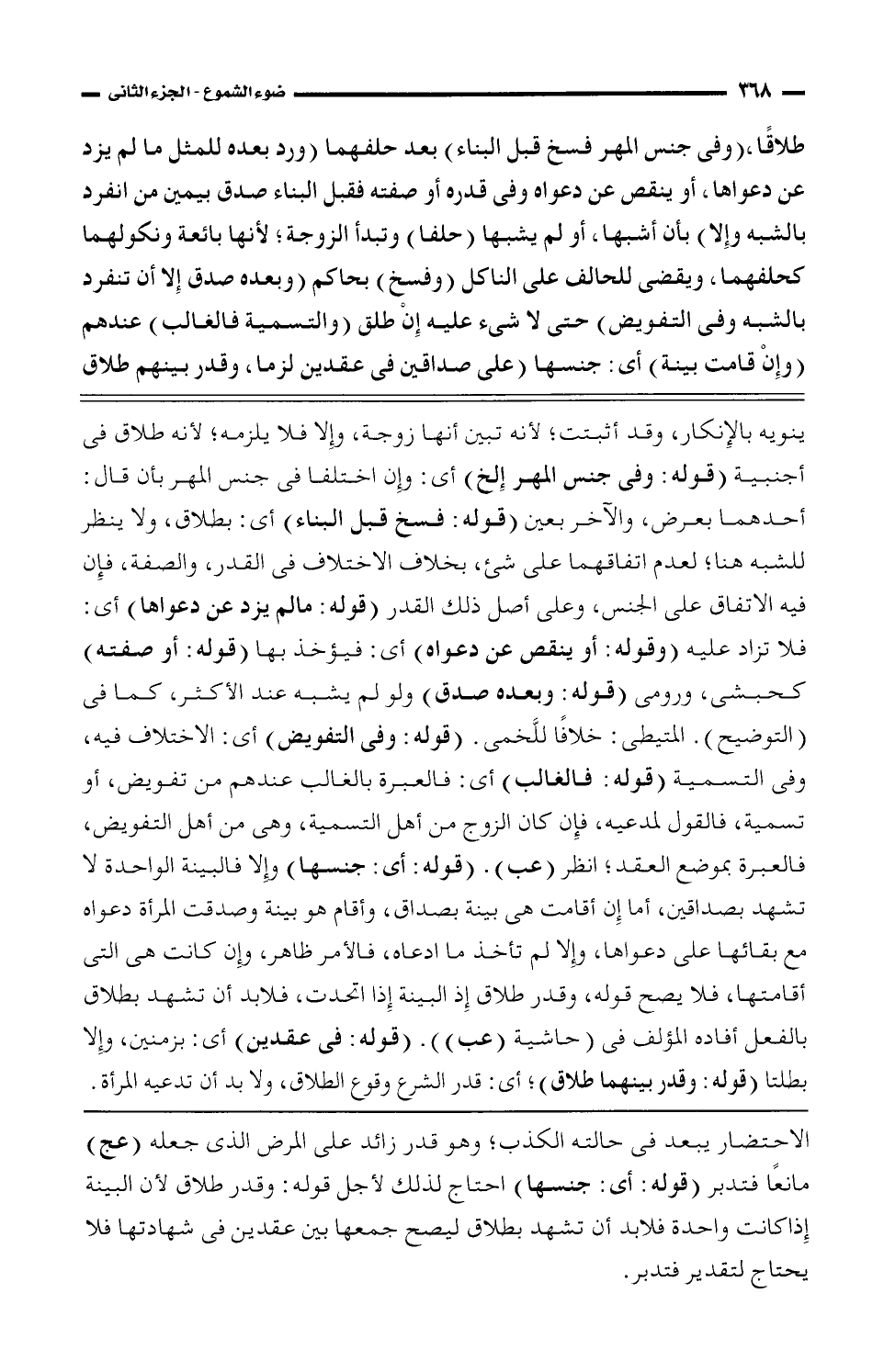 ينويه بالإنكار، وقد أثبتت؛ لأنه تبين أنها زوجة، وإلا فلا يلزمه؛ لأنه طلاق فى أجنبية (قوله: وفى جنس المهر إلخ) أى: وإن اختلفا في جنس المهر بأن قال: أحدهما بعرض، والآخر بعين (قوله: فسخ قبل البناء) أى: بطلاق: ولا ينظر للشبه هنا؛ لعدم اتفاقهما على شيء، بخلاف الاختلاف في القدر، والصفة، فإن فيه الاتفاق على الجنس، وعلى أصل ذلك القدر (قوله: ما لم يزد عن دعواها) أى: فلا تزاد عليه (وقوله: أو ينقص عن دعواه) أى: فيؤخذ بها (قوله: أو صفته) كحبشي، ورومي (قوله: وبعده صدق) ولو لم يشبه عند الأكثر، كما في (التوضيح). المتيطي: خلافًا للخمي. (قوله: وفي التفويض) أى: الاختلاف فيه، وفي التسمية (قوله: فالغالب) أى فالعبرة بالغالب عندهم من تفويض، أو تسمية، فالقول لمدعيه، فإن كان الزوج من أهل التسمية، وهي من أهل التفويض، فالعبرة بموضع العقد؛ انظر (عب). (قوله: أى: جنسها) وإلا فالبينة الواحدة لا تشهد بصادقين، أما إن أقامت هي ببينة بصداق، وأقام هو بينة وصدقت المرأة دعواه مع بقائها على دعواها، وإلا لم تأخذ ما ادعاه، فالأمر ظاهر، وإن كانت هي التي أقامتها، فلا يصح قوله، وقدر طلاق إذ البينة إذا اتحدت، فلابد أن تشهد بطلاق بالفعل أفاده المؤلف في (حاشية (عب)). (قوله: في عقدين) أى: بزمتين، وإلا بطلتا (قوله: وقدر بينهما طلاق)؛ أى: قدر الشرع وقوع الطلاق، ولابد أن تدعيه المرأة.