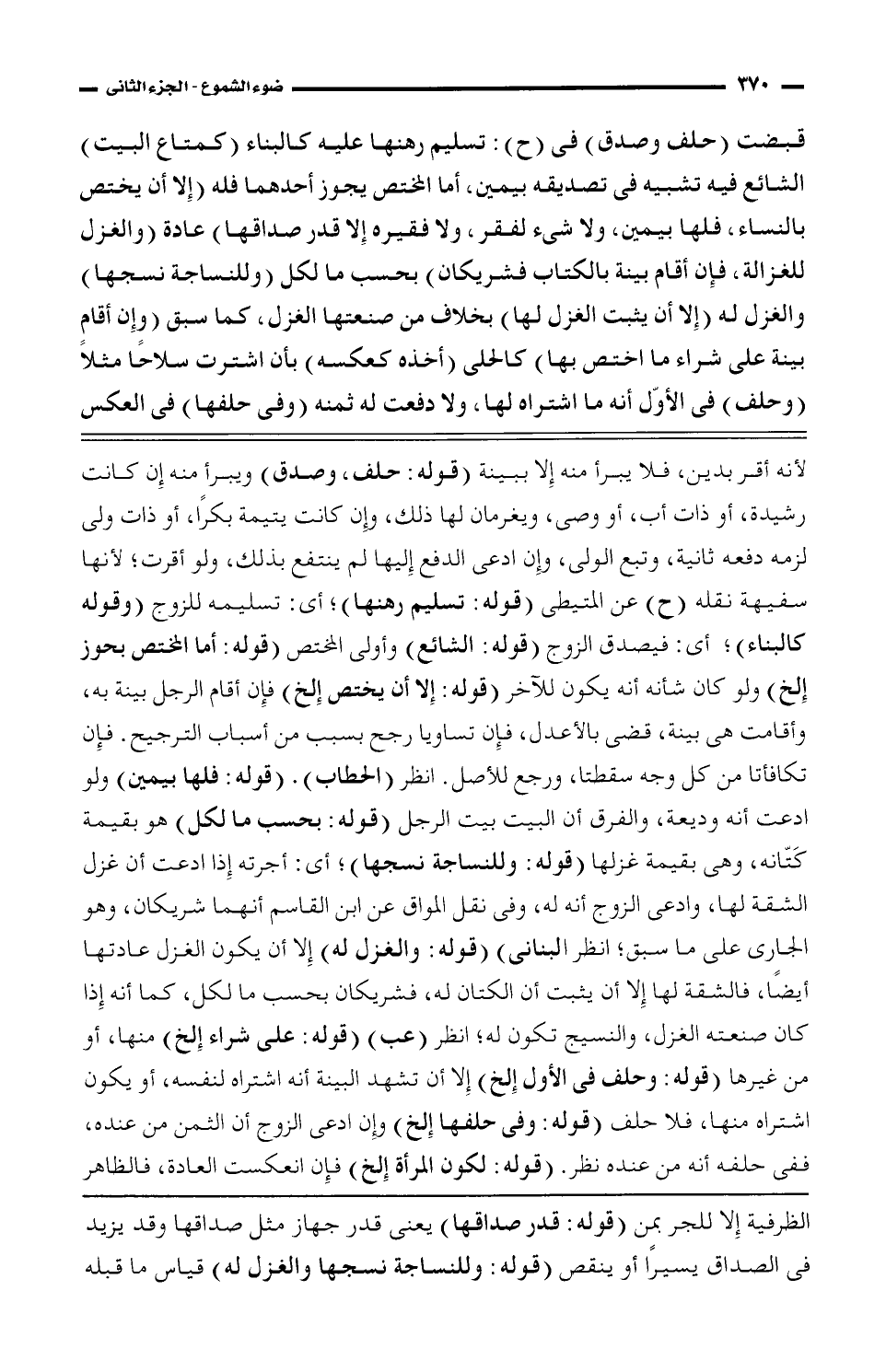 لأنه أقر بدين، فلا يبرأ منه إلا ببينة (قوله: حلف، وصدق) ويبرأ منه إن كانت رشيدة، أو ذات أب، أو وصي، ويغرمان لها ذلك، وإن كانت يتيمة بكرًا، أو ذات ولي لزمه دفعه ثانية، وتبع الولي، وإن ادعى الدفع إليها لم ينتفع بذلك، ولو أقرت؛ لأنها سفيهة نقله (ح) عن المتيطي (قوله: تسليم رهنها)؛ أى: تسليمه للزوج (وقوله كالبناء)؛ أى: فيصدق الزوج (قوله: الشائع) وأولى المختص (قوله: أما المختص بحوز إلخ) ولو كان شأنه أنه يكون للآخر (قوله: إلا أن يختص إلخ) فإن أقام الرجل بينة به، وأقامت هي بينة، قضي بالأعدل، فإن تساويا رجح بسببٍ من أسباب الترجيح. فإن تكافأتا من كل وجه سقطتها، ورجه للأصل. انظر (الحطاب). (قوله: فلها بيمين) ولو ادعت أنه وديعة، والفرق أن البيت بيت الرجل (قوله: بحسب ما لكل) هو بقيمة كتانه، وهي بقيمة غزلها (قوله: وللنساجة نسجها)؛ أى: أجرته إذا ادع أن غزل الشقة لها، وادعى الزوج أنه له، وفي نقل المواق عن ابن القاسم أنهما شريكان، وهو الجاري على ما شبق؛ انظر (البناني) (قوله: والغزل له) إلا أن يكون الغزل عادتها أيضًا، فالشقة لها إلا أن يثبت أن الكتان له، فشريكان بحسب ما لكل، كما أنه إذا كان صنعته الغزل، والنسيج تكون له؛ انظر (عب) (قوله: على شراء إلخ) منها، أو من غيرها (قوله: وحلف فى الأول إلخ) إلا أن تشهد البينة أنه اشتراه لنفسه، أو يكون اشتراه منها، فلا حلف (قوله: وفي حلفها إلخ) وإن ادعى الزوج أن الثمن من عنده، ففي حلفه أنه من عنده نظر. (قوله: لكون المرأة إلخ) فإن انعكست العادة، فالظاهر