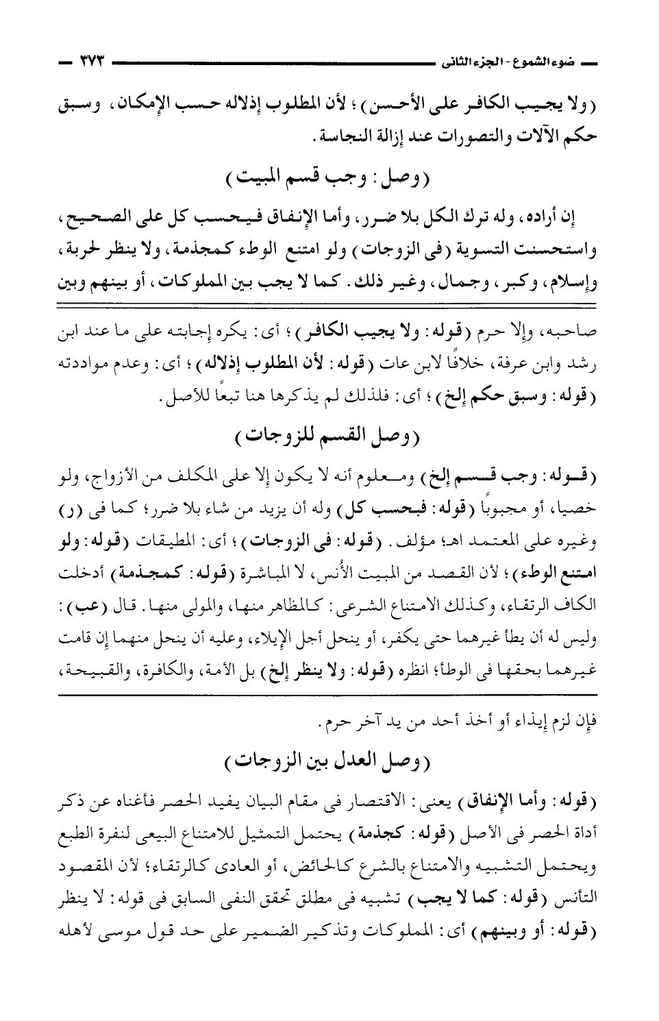إن أراده، وله ترك الكل بلا ضرر، وأما الإنفاق فيحسب كل على الصحيح، واستحسنت التسوية (في الزوجات) ولو امتنع الوطء كمجذبة، ولا ينظر لحربة، وإسلام، وكبر، وجمال، وغير ذلك. كما لا يجب بين المملوكات، أو بينهم وبين