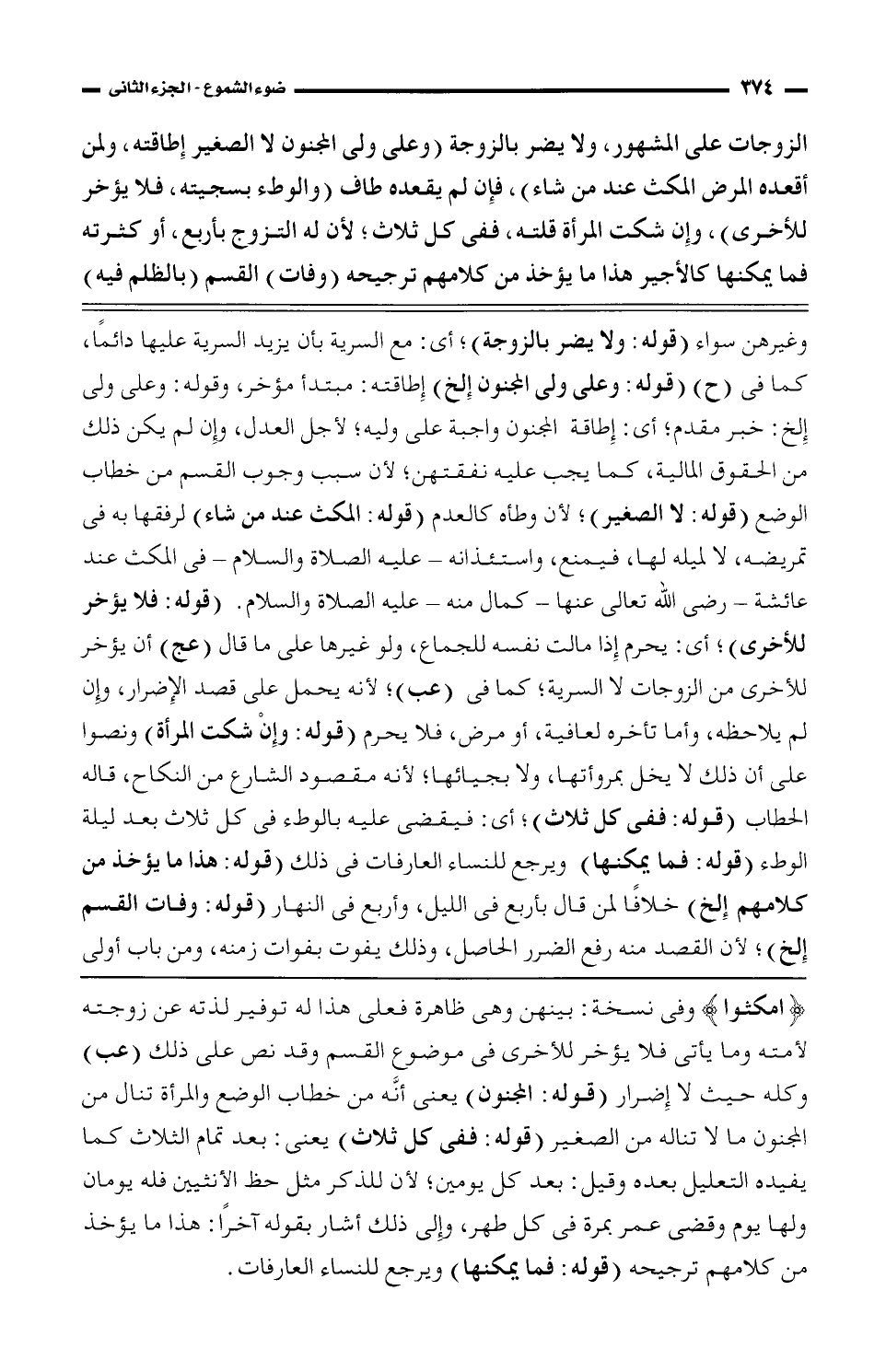 الزوجات على المشهور، ولا يضر بالزوجة (وعلى ولي المجنون لا الصغير إطاقته، ولمن أقعده المرض المكث عند من شاء)، فإن لم يقعده طاف (والوطء بسجيته، فلا يؤخر للأخرى)، وإن شكت المرأة قلته، ففي كل ثلاث؛ لأن له التزوج بأبرع، أو كثرته فما يمكنها كالأجير هذا ما يؤخذ من كلامهم ترجيحه (وفات) القسم (بالظلم فيه)