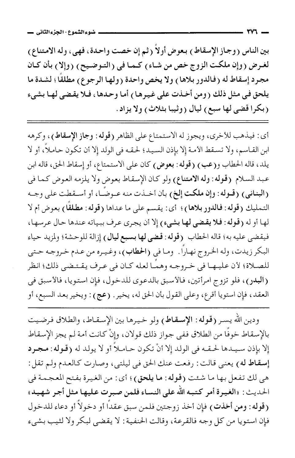 ودين الله يسر (قوله: الإسقاط) ولو خيرها بين الإسقاط، والطلاق فرضيت بالإسقاط خوفًا من الطلاق ففى جواز ذلك قولان، وإن كانت أمة لم يجز الإسقاط إلا بإذن سيدها لحقه فى الولد إلا أن تكون حاملًا أو لا يولد له (قوله: مجرد إسقاط له) يعني قالت: رفعت عنك الحق فى ليلتي، وصارت كالعدم ولم تقل: هي لك تفعل بها ما شئت (قوله: ما يلحق)؛ أى: من الغيرة بفتح المعجمة فى الحديث: "الغيرة أمر كتبه الله على النساء فلمن صبرت عليها مثل أجر شهيد" (قوله: ومن أخذت) فإن أخذ زوجتين فلمن سبق عقدًا أو دخولًا أو دعاء للدخول فإن استويا من كل وجه فالقرعة، وقالت الحنفية: لا يقضي لبكر ولا لثيب بشيء