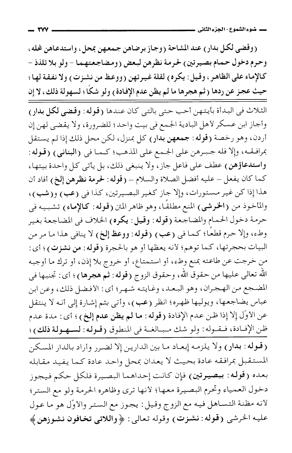 (وقضى لكل بدار) عند المشاحة (وجاز برضاهن جمعهن يمحل، واستدعاهن لمحله، وحرم دخول حمام بصيرتين) لحرمة نظرهن لبعض (ومضاجعتهما -ولو بلا تلذذ- كالإماء على الظاهر، وقيل: يكره) لقله غيرتهن (ووعظ من نشزت) ولا نفقة لها؛ حيث عجز عن ردها (ثم هجرها ما لم يظن عدم الإفادة) ولو شكًا؛ لسهولة ذلك، لا إن