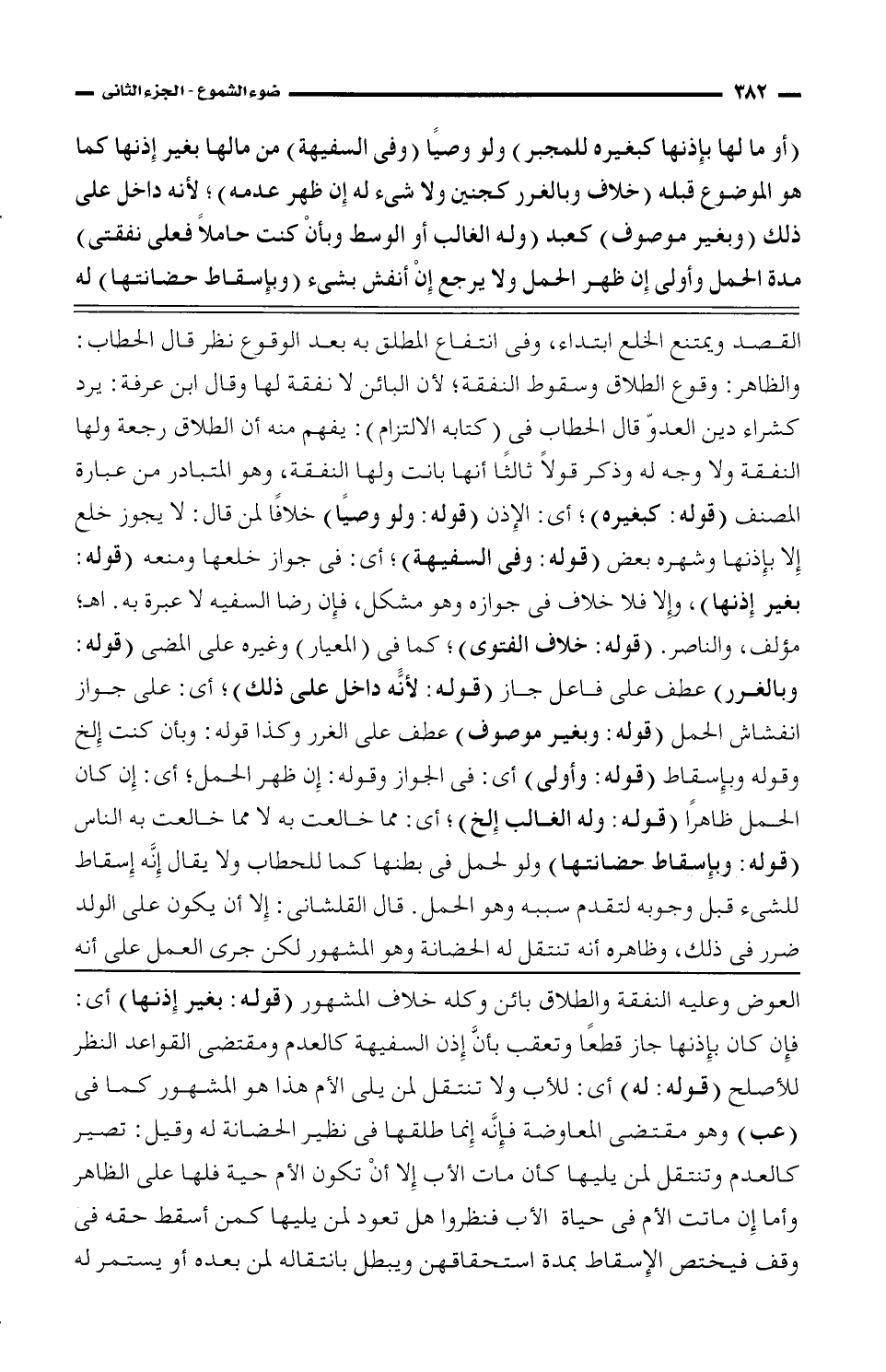 القصد ويمتنع الخلع ابتداء، وفى انتفاع المطلق به بعد الوقوع نظر قال الحطاب: والظاهر: وقوع الطلاق وسقوط النفقة؛ لأن البائن لا نفقة لها وقال ابن عرفة: يرد كشراء دين العدو قال الحطاب فى كتابه (الالتزام): يفهم منه أن الطلاق رجعه ولها النفقة ولا وجه له وذكر قولًا ثالثًا أنها بانت ولها النفقة، وهو المتبادر من عبارة المصنف (قوله: كبغيره)؛ أى: الإذن (قوله: ولو وصيًا) خلافًا لمن قال: لا يجوز خلع إلا بإذنها وشهره بعض (قوله: وفى السفيهة)؛ أى: فى جواز خلعها ومنعه (قوله: بغير إذنها)، وإلا فلا خلاف فى جوازه وه ومشكل، فإن رضا السفيه لا عبرة به. اه؛ مؤلف، والناصر. (قوله: خلاف الفتوى)؛ كما فى (المعيار) وغيره على المضى (قوله: وبالغرر) عطف على فاعل جاز (قوله: لأنه داخل على ذلك)؛ أى: على جواز انفشاش الحمل (قوله: وبغير موصوف) عطف على الغرر وكذا قوله: وبأن كنت إلخ وقوله وبإسقاط (قوله: وأولى) أى: في الجواز وقوله: إن ظهر الحمل؛ أى: إن كان الحمل ظاهرًا (قوله: وله الغالب إلخ)؛ أى: مما خالعت به لا مما خالعت به الناس (قوله: وبإسقاط حضانتها) ولو الحمل فى بطنها كما للحطاب ولا يقال إنه إسقاط للشئ قبل وجوبه لتقدم سببه وهو الحمل. قال القلشاني: إلا أن يكون على الولد ضرر فى ذلك، وظاهره أنه تنتقل له الحضانة وهو المشهور لكن جرى العمل على أنه