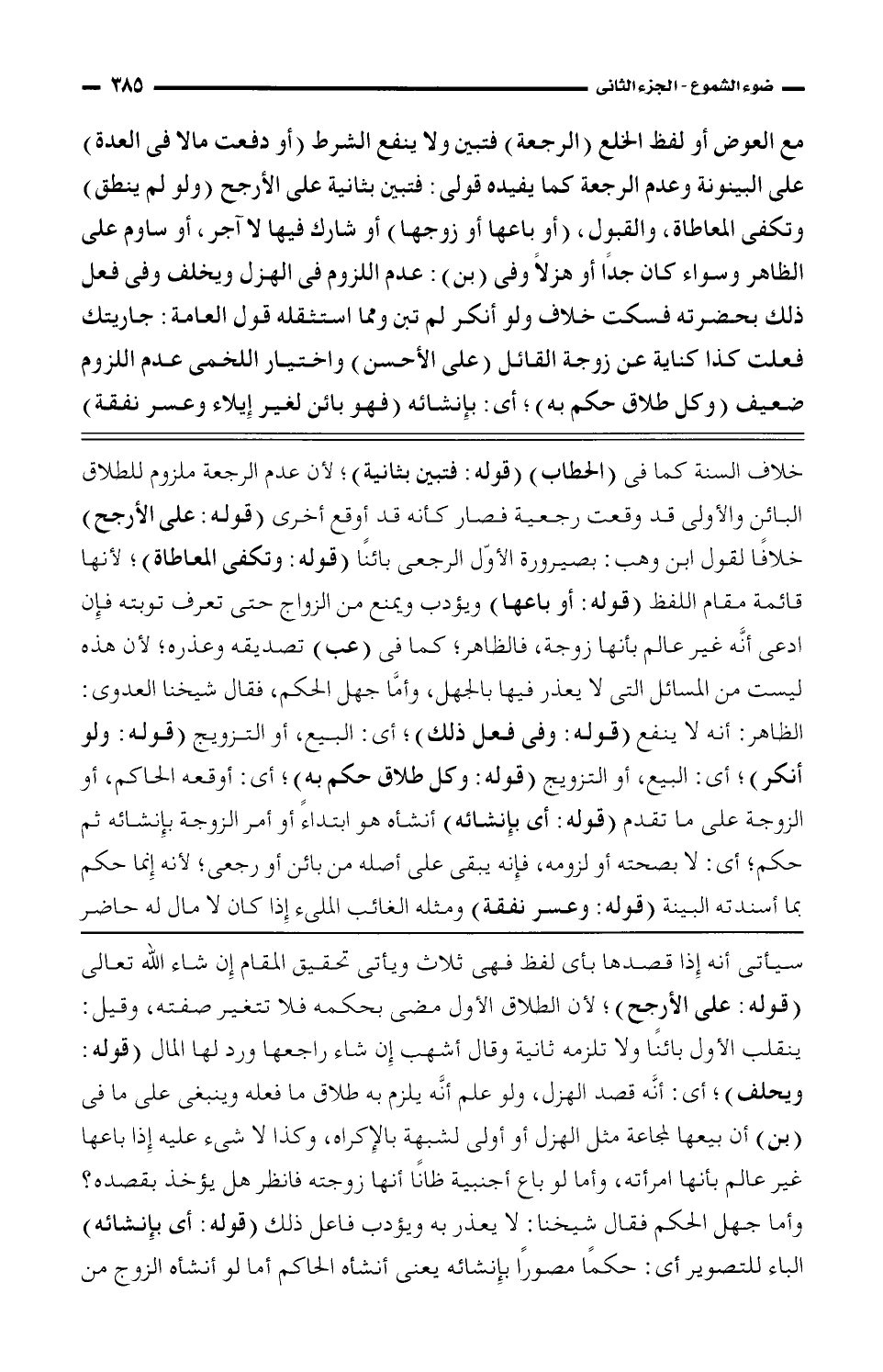 مع العوض أو لفظ الخلع (الرجعة) فتبين ولا ينفع الشرط (أو دفعت مالًا فى العدة) على البينونة وعدم الرجعة كما يفيده قولى: فتبين بثانية على الأرجح (ولو لم ينطق) وتكفى المعاطاة، والقبول، (أو باعها أو زوجها) أو شارك فيها لا آجر، أو ساوم على الظاهر وسواء كان جدًا أو هزلًا وفى (بن): عدم اللزوم فى الهزل ويخلف وفى فعل ذلك بحضرته فسكت خلاف ولو أنكر لم تبن وما استثقله قوله العامة: جاريتك فعلت كذا كناية عن زوجة القائل (على الأحسن) واختيار اللخمى عدم اللزوم ضعيف (وكل طلاق حكم به)؛ أى: بإنشائه (فهو بائن لغير إيلاء وعسر نفقة)