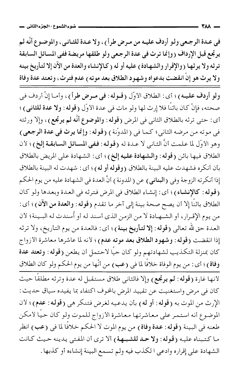 فى عدة الرجعى ولو أردف عليه من مرض طرأ)، ولا عدة للثانى، والموضوع أنه لم يرتجع قبل الإرداف (وإنما ترث فى عة الرجعى ولو طلقها مريضة ففى المسائل السابقة ترثه ولا يرثها (والإقرار والشهادة) عليه أو له (كالإنشاء والعدة من الآن إلا لتأريخ بينه ولا يرث هو إن انقضت بدعواه وشهود الطلاق بعد موته) عم فترث، وتعتد عدة وفاة