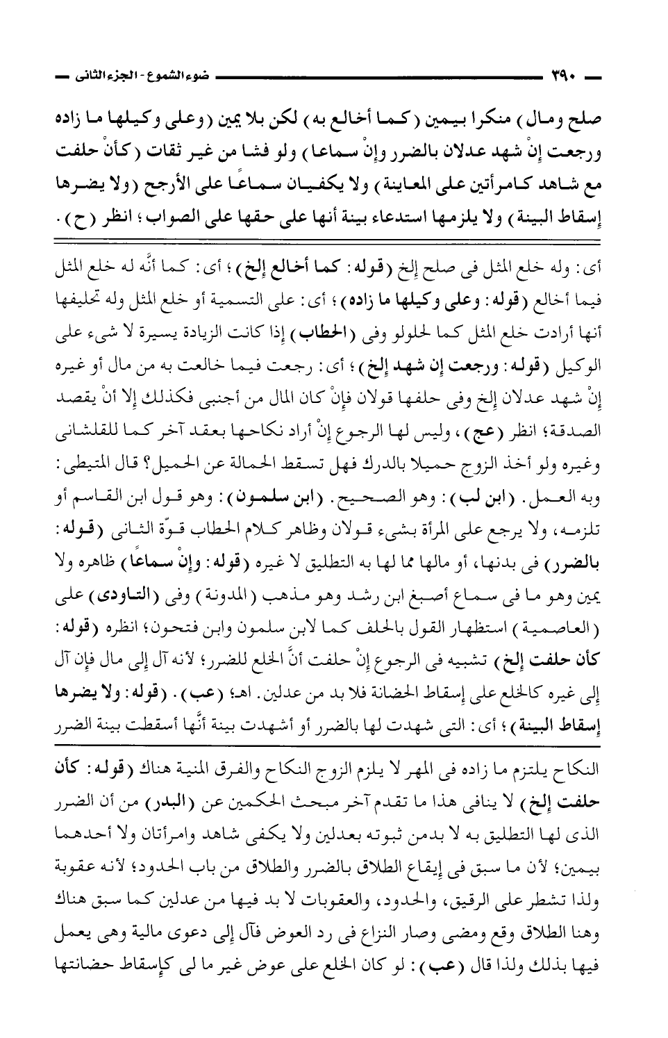 النكاح يلتزم ما زاده فى المهر لا يلزم الزوج النكاح والفرق المنية هناك (قوله: كأن حلفت إلخ) لا ينافى هذا ما تقدم آخر مبحث الحكمين عن (البدر) من أن الضرر الذى لها التطليق به لابد من ثبوته بعدلين ولا يكفى شاهد وامرأتان ولا أحهما بيمين؛ لأن ما سبق في إيقاع الطلاق بالضرر والطلاق من باب الحدود؛ لأنه عقوبة ولذا تشطر على الرقيق، والحدود، والعقوبات لابد فيها من عدلين كما سبق هناك وهنا الطلاق وقع ومضى وصار النزاع فى رد العوض فآل إلى دعوى مالية وهى يعمل فيها بذلك ولذا قال (عب): لو كان الخلع على عوض غير ما لى كإسقاط حضانتها