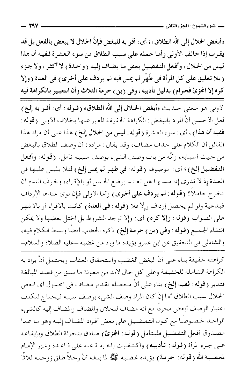 كراهته خفيفة بناء على أن البغض الغضب واستحقاق العقاب ويحتمل أن يراد به الكراهة الشاملة للخفيفة وعلى كل حال لابد من معونة ما سبق من قصد المبالغة فتدبر (قوله: ففيه إلخ) بناء على أن محصلة تقدير مضاف فى المحمول أى أبغض الحلال سبب الطلاق أما إن كان المراد وصف الشئ بوصف سببه فيحتاج لتكلف اعتبار الوصف أبغض مجردًا مع أنه مضاف للحلال والمضاف والمضاف إليه كالشئ الواحد خصوصًا مع كون التفضيل على بعض أفراد المضاف إليه وهو ما عدا مصدوق أفعل التفضيل فليتأمل (قوله: المجزئ) صادق بتجزئة الطلاق وبإيقاعه على جزء المرأة (قوله: تأديبه) واكتفيت بالحرمة عنه على قاعدة وعزر الإمام لمعصية الله (قوله: حرمة) يؤيد غضبه صلى الله عليه وسلم لما بلغه أن رجلًا طلق زوجته ثلاثًا