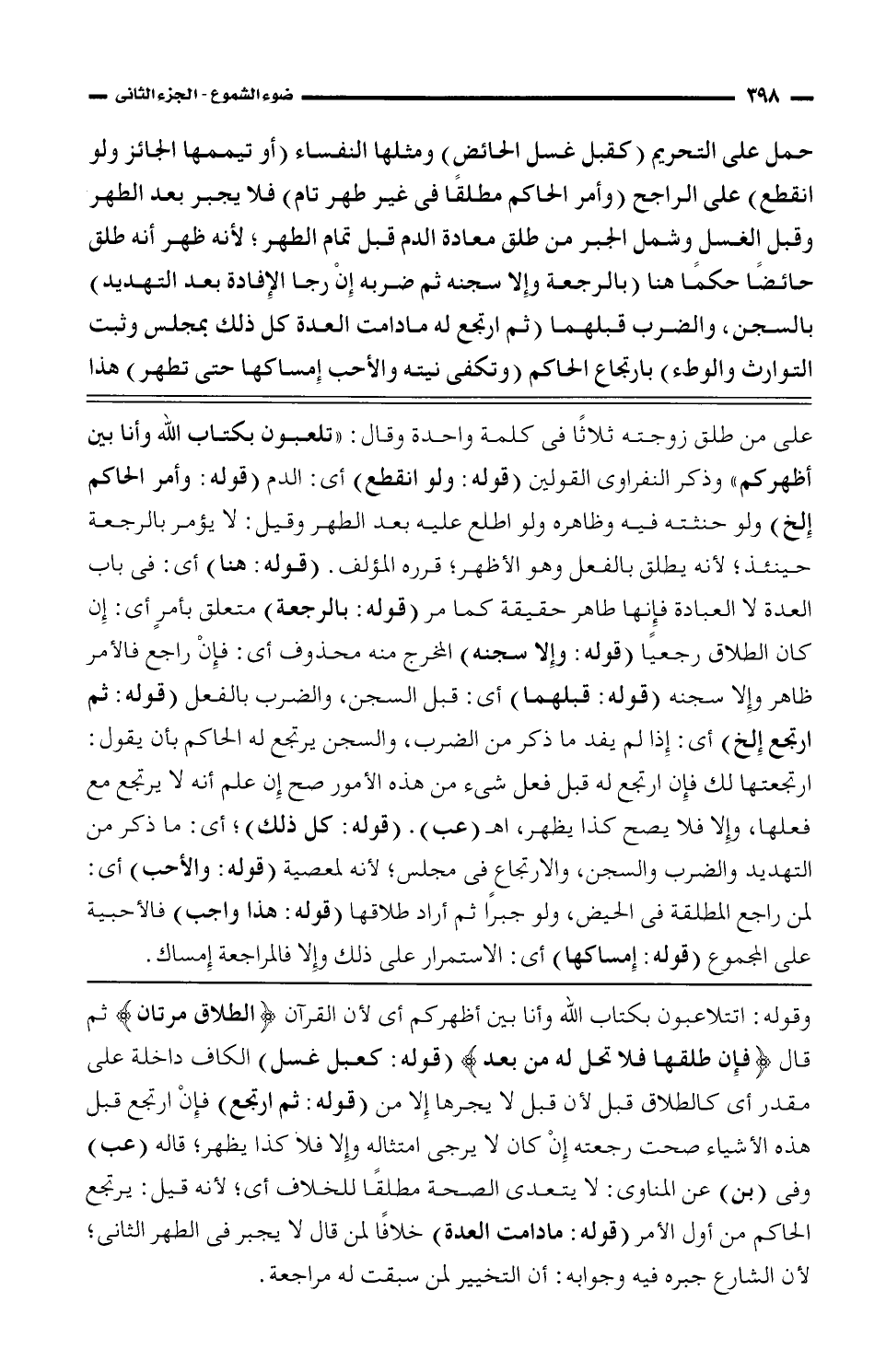 حمل على التحريم (كقبل غسل الحائض) ومثلها النفساء (أو تيممها الجائز ولو انقطع) على الراجح (وأمر الحاكم مطلقًا فى غير طهر تام) فلا يجبر بعد الطهر وقبل الغسل وشمل الجبر من طلق معادة الدم قبل تمام الطهر؛ لأنه ظهر أنه طلق حائضًا حكمًا هنا (بالرجعة وإلا سجنه ثم ضربه إن رجا الإفادة بعد التهديد) بالسجن، والضرب قبلهما (ثم ارتجع له ما دامت العدة كل ذلك بمجلس وثبت التوارث والوطء) بارتجاع الحاكم (وتكفى نيته والأحب إمساكها حتى تطهر) هذا