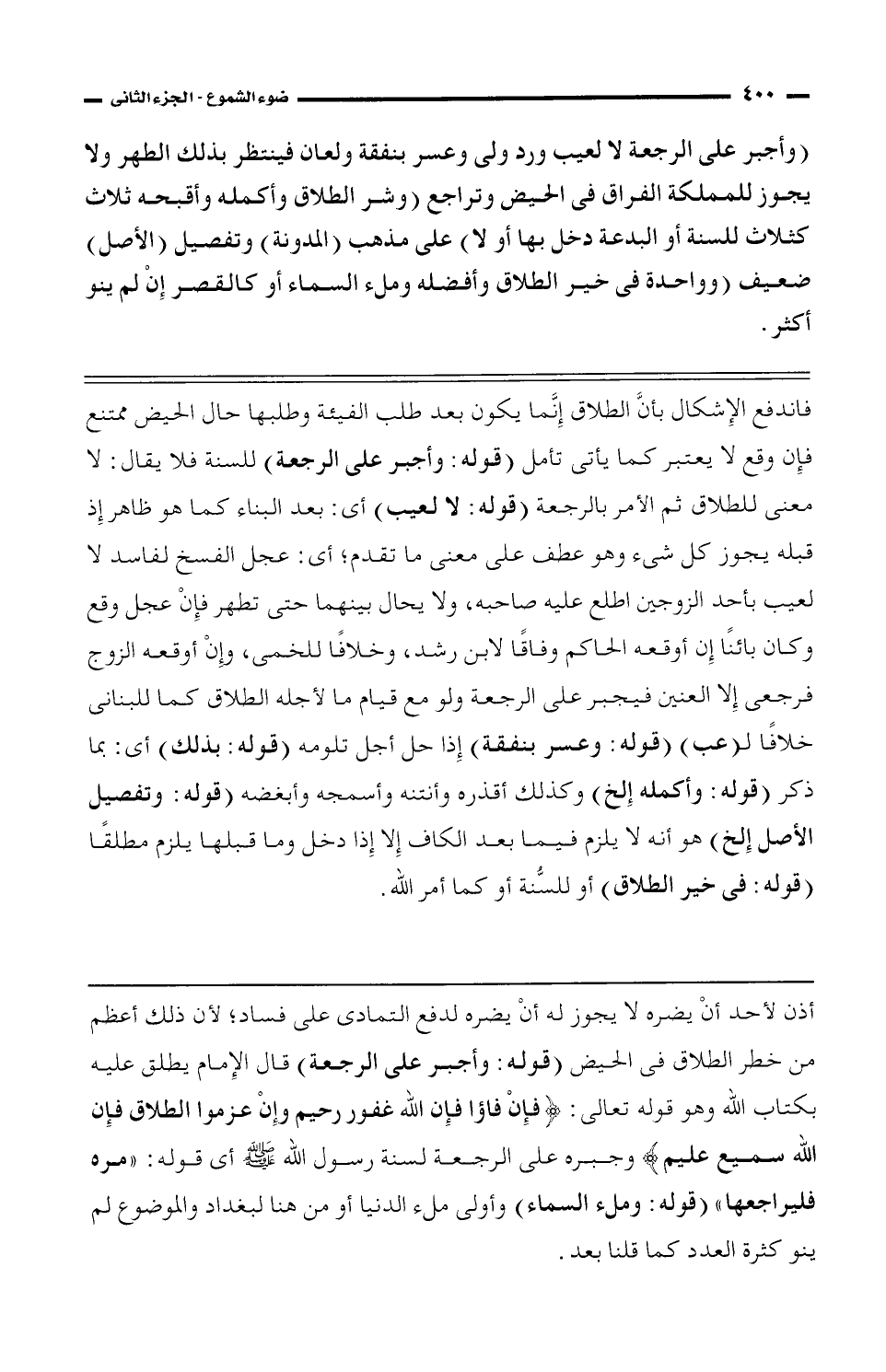 أذن لأحد أن يضره لا يجوز له أن يضره لدفع التمادى على فساد؛ لأن ذلك أعظم من خطر الطلاق فى الحيض (قوله: وأجبر على الرجعة) قال الإمام يطلق عليه بكتاب الله وهو قوله تعالى: (فإن فاءوا فإن الله غفور رحيم وإن عزموا الطلاق فإن الله سميع عليم) وجبره على الرجعة لسنة رسول الله صلى الله عليه وسلم أى قوله: "مره فليراجعها" (قوله: وملء السماء) وأولى ملء الدنيا أو من هنا لبغداد والموضوع لم ينو كثرة العدد كما قلنا بعد