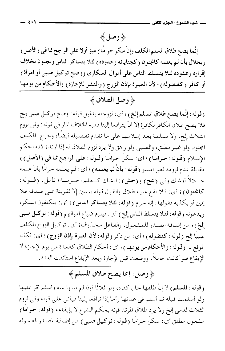(قوله: المسلم) لا إن طلقها حال كفره، ولو ثلاثًا فإذا لم يبنها عنه وأسلم أقر عليها ولو أسلمت قبله ثم أسلم فى عدتها وأما إذا ترافعا إلينا فيأتى على قوله وفى لزوم الثلاث لذمى إلخ ولا يرد طلاق المرتد فإنه بحكم الشرع لا بإيقاعه (قوله: حرامًا) مفعول مطلق أى: سكرًا حرامًا (قوله: توكيل صبى) من إضافة المصدر لمعموله