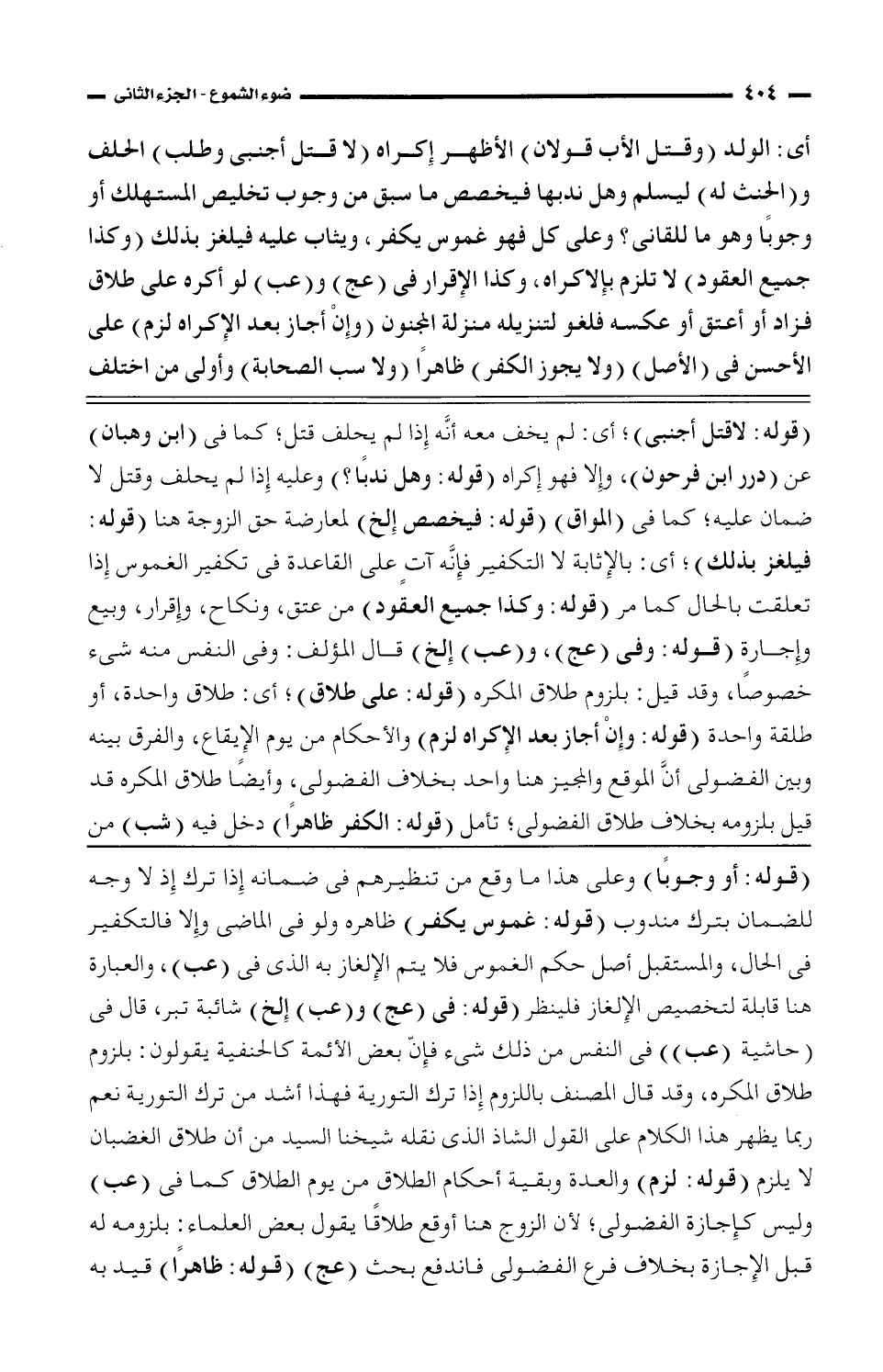 (قوله: لا قتل أجنبي)؛ أى: لم يخف معه أنه إذا لم يحلف قتل؛ كما فى (ابن وهبان) عن (درر ابن فرحون)، وإلا فهو إكراه (قوله: وهل ندبًا؟ ) وعليه إذا لم يحلف وقتل لا ضمان عليه؛ كما فى (المواق) (قوله: فيخصص إلخ) لمعارضة حق الزوجة هنا (قوله: فيلغز بذلك)؛ أى: بالإثابة لا التكفير فإنه آت على القاعدة فى تكفير الغموس إذا تعلقت بالحال كما مر (قوله: وكذا جميع العقود) من عتق، ونكاحن وإقرارن وبيع وإجارة (قوله: وفى (عج)، و (عب) إلخ) قال المؤلف: وفى النفس منه شئ خصوصًا، وقد قيل: بلزوم طلاق المكره (قوله: على طلاق)؛ أى: طلاق واحدة، أو طلقة واحدة (قوله: وإن أجاز بعد الإكراه لزم) والأحكام من يوم الإيقاع، والفرق بينه وبين الفضولى أن الموقع والمجيز هنا واحد بخلاف الفضولى. وأيضًا طلاق المكره قد قيل بلزومه بخلاف طلاق الفضولى؛ تأمل (قوله: الكفر ظاهرًا) دخل فيه (شب) من