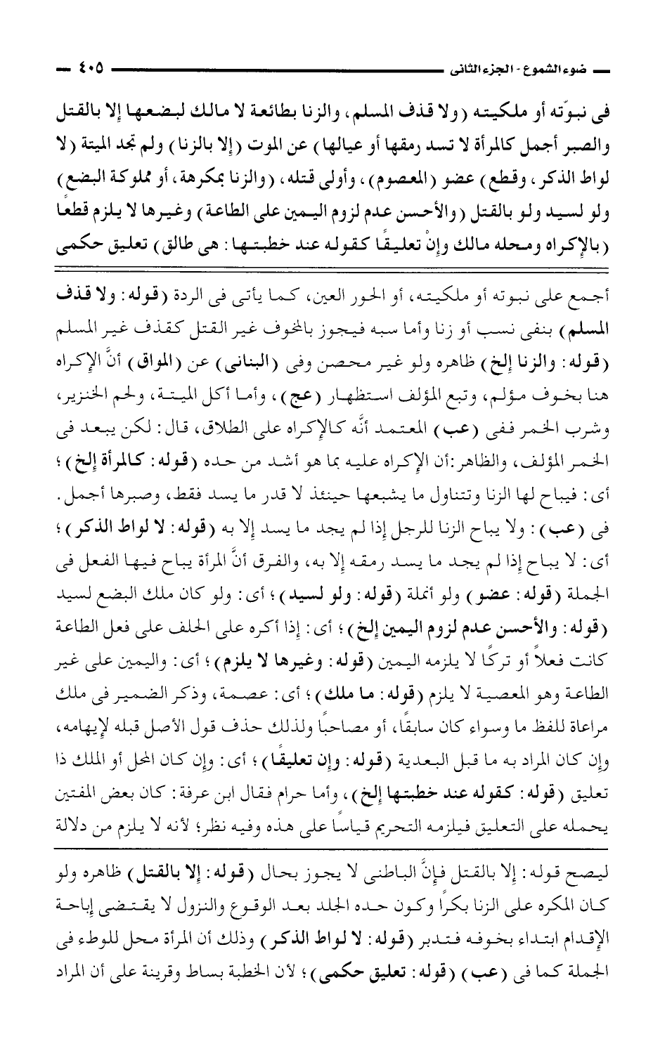فى نبوته أو ملكيته (ولا قذف المسلم، والزنا بطائعة لا مالك لبعضها إلا بالقتل والصبر أجمل كالمرأة لا تسد رمقها أو عيالها) عن الموت (إلا بالزنا) ولم تجد الميتة (لا لواط الذكر، وقطع) عضو (المعصوم)، وأولى قتله، (والزنا بمكرهة، أو مملوكة البضع) ولو لسيد ولو بالقتل (والأحسن عدم لزوم اليمين على الطاعة) وغيرها لا يلزم قطعًا (بالإكراه ومحله مالك وإن تعليقًا كقوله عند خطبتها: هى طالق) تعليق حكمى
