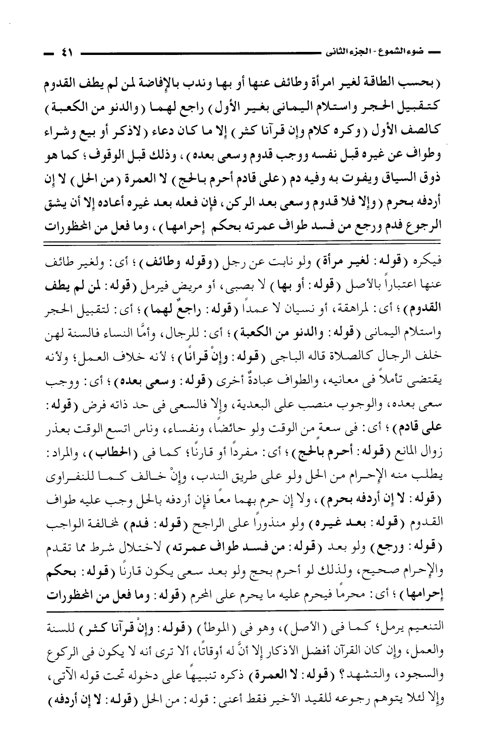 التنعيم يرمل؛ كما فى (الأصل)، وهو فى (الموطأ) (قوله: وإن قرآنا كثير) للسنة العمل، وإن كان القرآن أفضل الأذكار إلا أنَّ له أوقاتًا، ألا ترى أنه لا يكون فى الركوع والسجود، والتشهد؟ (قوله: لا العمرة) ذكره تنبيهًا على دخوله تحت قوله الآتى، وإلا لئلا يتوهم رجوعه للقيد الأخير فقط أعنى: قوله: من الحل (قوله: لا إن أردفه)