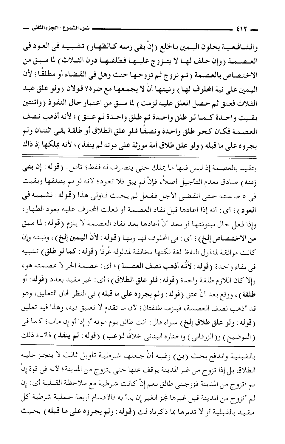والشافعية يحلون اليمين بالخلع (إن بقى زمنه كالظهار) تشبيه فى العود فى العصمة (وإن حلف لها لا يتزوج عليها فطلقها دون الثلاث) لما سبق من الاختصاص بالعصمة (ثم تزوج ثم تزوجها حنث وهل فى القضاء أو مطلقًا؛ لأن اليمين على نية المحلوف لها) ونيتها أن لا يجمعها مع ضرة؟ قولان (ولو علق عبد الثلاث فعتق ثم حصل المعلق عليه لزمت) لما سبق من اعتبار حال النفوذ (واثنتين بقيت واحدة كما لو طلق واحدة ثم طلق واحدة ثم عتق)؛ لأنه أذهب نصف العصمة فكان كحر طلق واحدة ونصفًا فلو علق الطلاق أو طلقة بقى اثنتان ولم يجروه على ما قبله (ولو علق طلاق أمه مورثة على موته لم ينفذ)؛ لأنه يملكها إذ ذاك