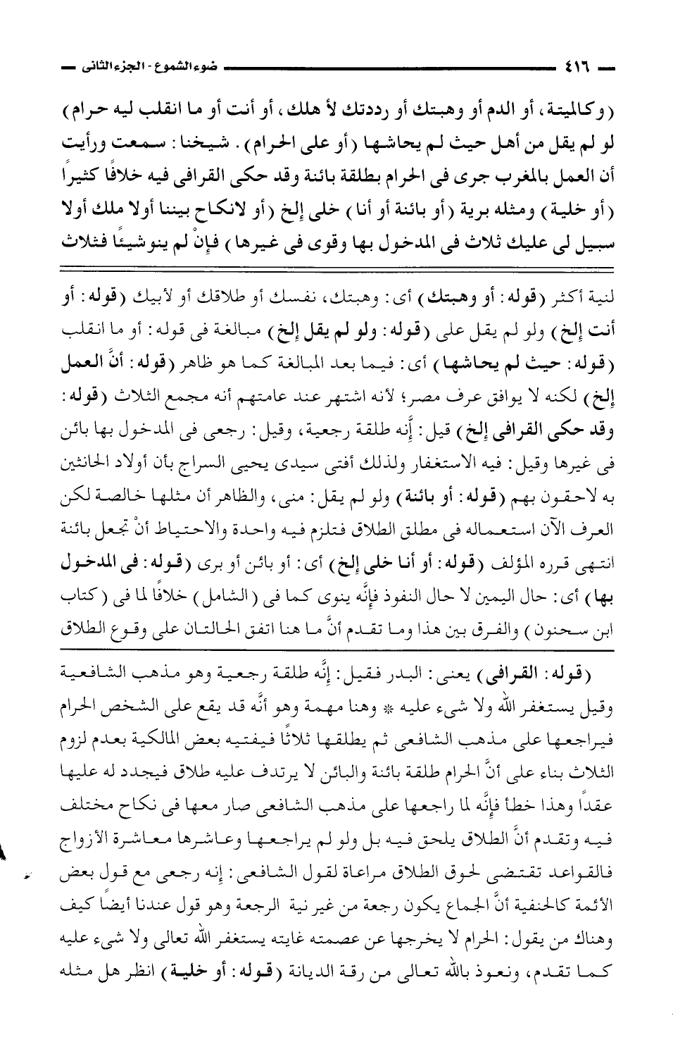 (قوله: القرافى) يعنى: البدر فقيل: إنه طلقة رجعية وهو مذهب الشافعية وقيل يستغفر الله ولا شئ عليه *وهنا مهمة وهو أنه قد يقع على الشخص الحرام فيراجعها على مذهب الشافعى ثم يطلقها ثلاثًا فيفتيه بعض المالكية بعدم لزوم الثلاث بناء على أن الحرام طلقة بائنة والبائن لا يرتدف عليه طلاق فيجدد له عليها عقدًا وهذا خطأ فإنه لما راجعها على مذهب الشافعى صار معها فى نكاح مختلف فيه وتقدم أن الطلاق يلحق فيه بل ولو لم يراجعها وعاشرها معاشرة الأزواج فالقواعد تقتضى لحوق الطلاق مراعاة لقول الشافعى: إنه رجعى مع قول بعض الأئمة كالحنفية أن الجماع يكون رجعة من غير نية الرجعة وهو قول عندنا أيضًا كيف وهناك من يقول: الحرام لا يخرجها عن عصمته غايته يستغفر الله تعالى ولا شئ عليه كما تقدم، ونعوذ بالله تعالى من رقة الديانة (قوله: أو خلية) انظر هل مثله
