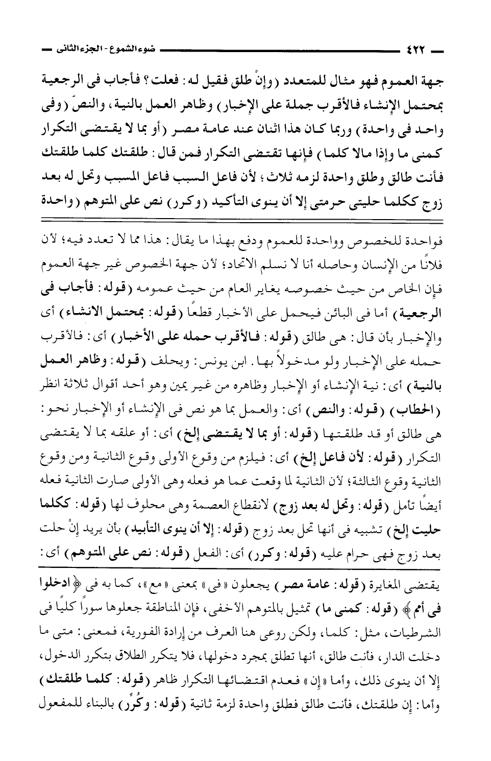جهة العموم فهو مثال للمتعدد (وإن طلق فقيل له: فعلت "فأجاب فى الرجعية بمحتمل الإنشاء فالأقرب جملة على الإخبار) وظاهر العمل بالنية، والنص (وفى واحد فى واحدة) وربما كان هذا اثنان عند عامة مصر (أو بما لا يقتضى التكرار كمنى ما وإذا مالا كلما) فإنها تقتضى التكرار فمن قال: طلقتك كلما طلقتك فأنت طالق وطلق واحدة لزمه ثلاث؛ لأن فاعل السبب فاعل المسبب وتحل له بعده زوج ككلما حليتى حرمتى إلا أن ينوى التأكيد (وكرر) نص على المتوهم (واحدة