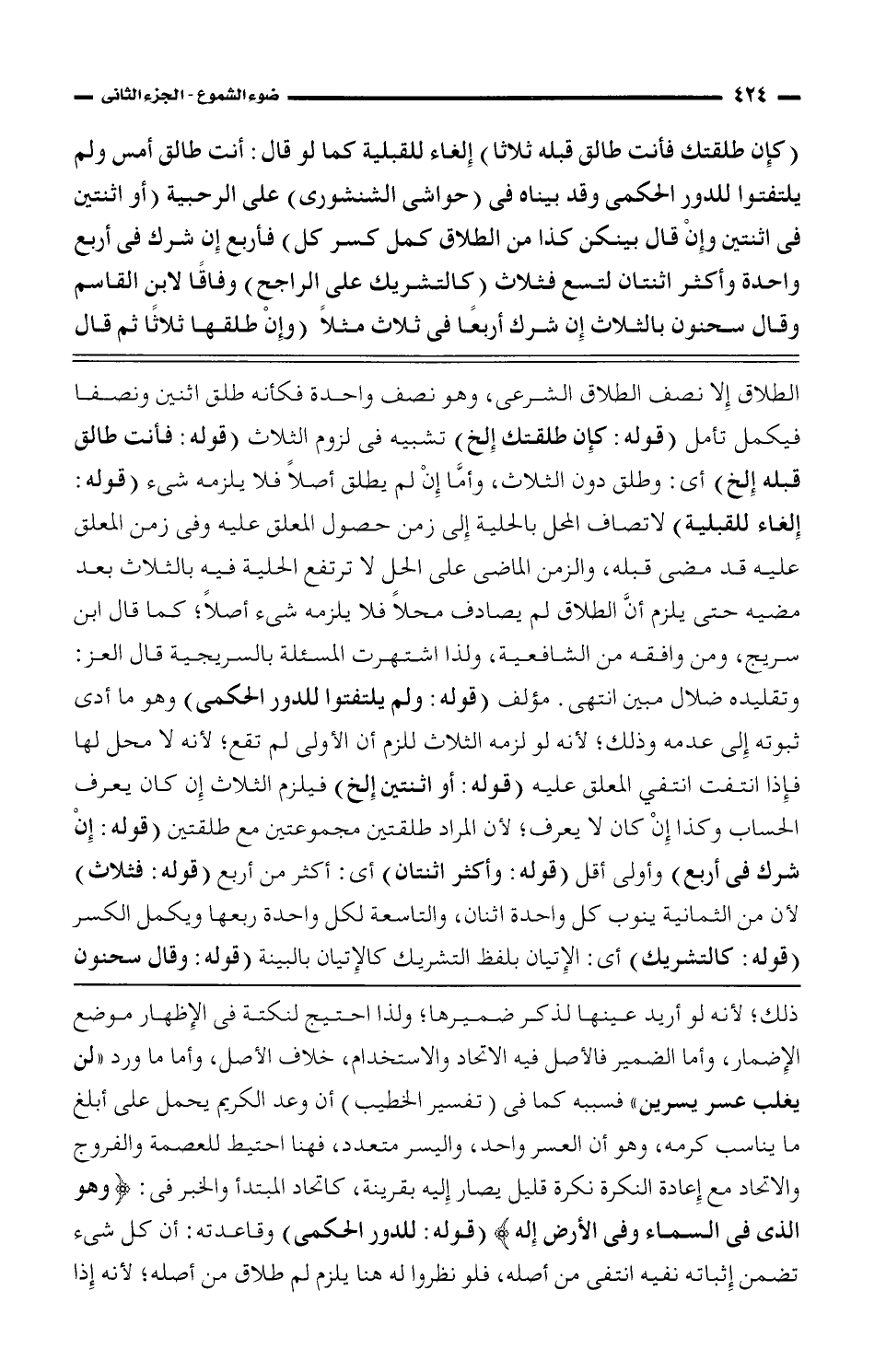 ذلك، لأنه لو أريد عينها لذكر ضميرها؛ ولذا احتيج لنكته فى الإظهار موضع الإضمار، وأما الضمير فالأصل فيه الاتحاد والاستخدام، خلاف الأصل، وأما ما ورد "لن يغلب عسر يسرين" فسببه كما فى (تفسير الخطيب) أن وعد الكريم يحمل على أبلغ ما يناسب كرمه، وهو أن العسر واحد، واليسر متعدد، فهنا احتيط للعصمة والفروج والاتحاد مع إعادة النكرة نكرة قليل يصار إليه بقرينة، كاتحاد المبتدأ والخبر فى: (وهو الذى فى السماء وفى الأرض إله) (قوله: للدور الكمى) وقاعدته: أن كل شئ تضمن إثباته نفيه انتفى من أصله، فلو نظروا له هنا يلزم لم طلاق من أصله؛ لأنه إذا