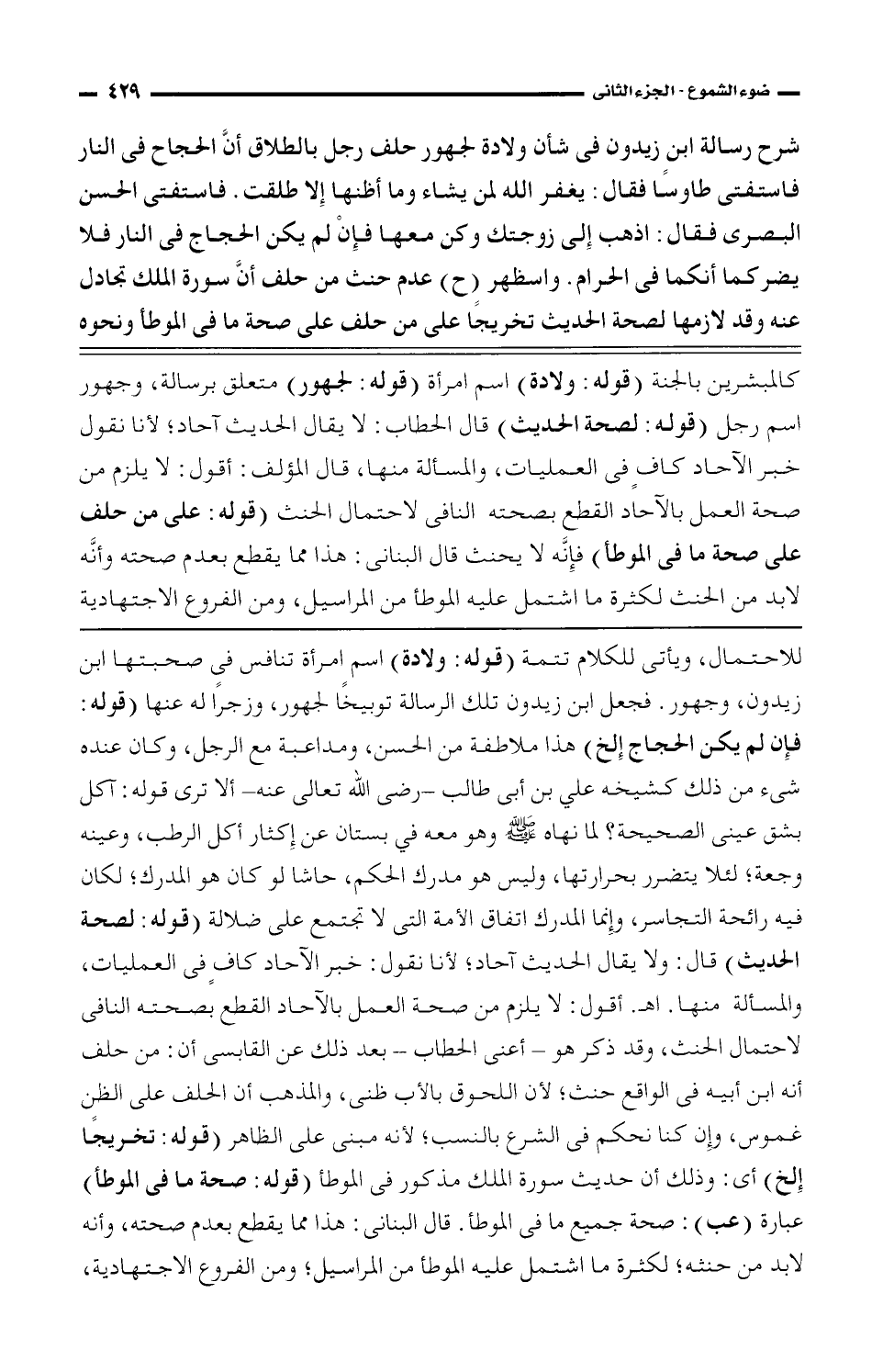 للاحتمال، ويأتي للكلام تتمة (قوله: ولادة) اسم امرأة تنافس في صحبتها ابن زيدون تلك الرسالة توبيخًا لجهور، وزجرًا له عنها (قوله: فإن لم يكن الحجاج إلخ) هذا ملاطفة من الحسن، ومداعبة مع الرجل، وكان عنده شيء من ذلك كشيخه علي بن أبي طالب- رضي الله تعالى عنه- ألا ترى قوله: آكل بشق عيني الصحيحة؟ لما نهاه صلى الله عليه وسلم وهو معه في بستان عن إكثار أكل الرطب، وعينه وجعة؛ لئلا يتضرر بحرارتها، وليس هو مدرك الحكم، حاشا لو كان هو المدرك؛ لكان فيه رائحة التجاسر، وإنما المدرك اتفاق الأمة التي لا تجتمع على ضلالة (قوله: لصحة الحديث) قال: ولا يقال الحديث آحاد؛ لأنا نقول: خبر الآحاد كافٍ في العمليات، والمسألة منها. اهـ. أقول: لا يلزم من صحة العمل بالآحاد القطع بصحته النافي لاحتمال الحنث، وقد ذكر هو- أعنى الحطاب- بعد ذلك عن القابسى أن: من حلف أنه ابن أبيه في الواقع حنث؛ لأن اللحوق بالأب ظني، والمذهب أن الحلف على الظن غموس، وإن كنا نحكم في الشرع بالنسب؛ لأنه مبنى على الظاهر (قوله: تخريجًا إلخ) أي: وذلك أن حديث سورة الملك مذكور في الموطأ (قوله: صحة ما في الموطأ) عبارة (عب): صحة جميع ما في الموطأ. قال البنانى: هذا مما يقطع بعدم صحته، وأنه لابد من حنثه؛ لكثرة ما اشتمل عليه الموطأ من المراسيل؛ ومن الفروع الاجتهادية،
