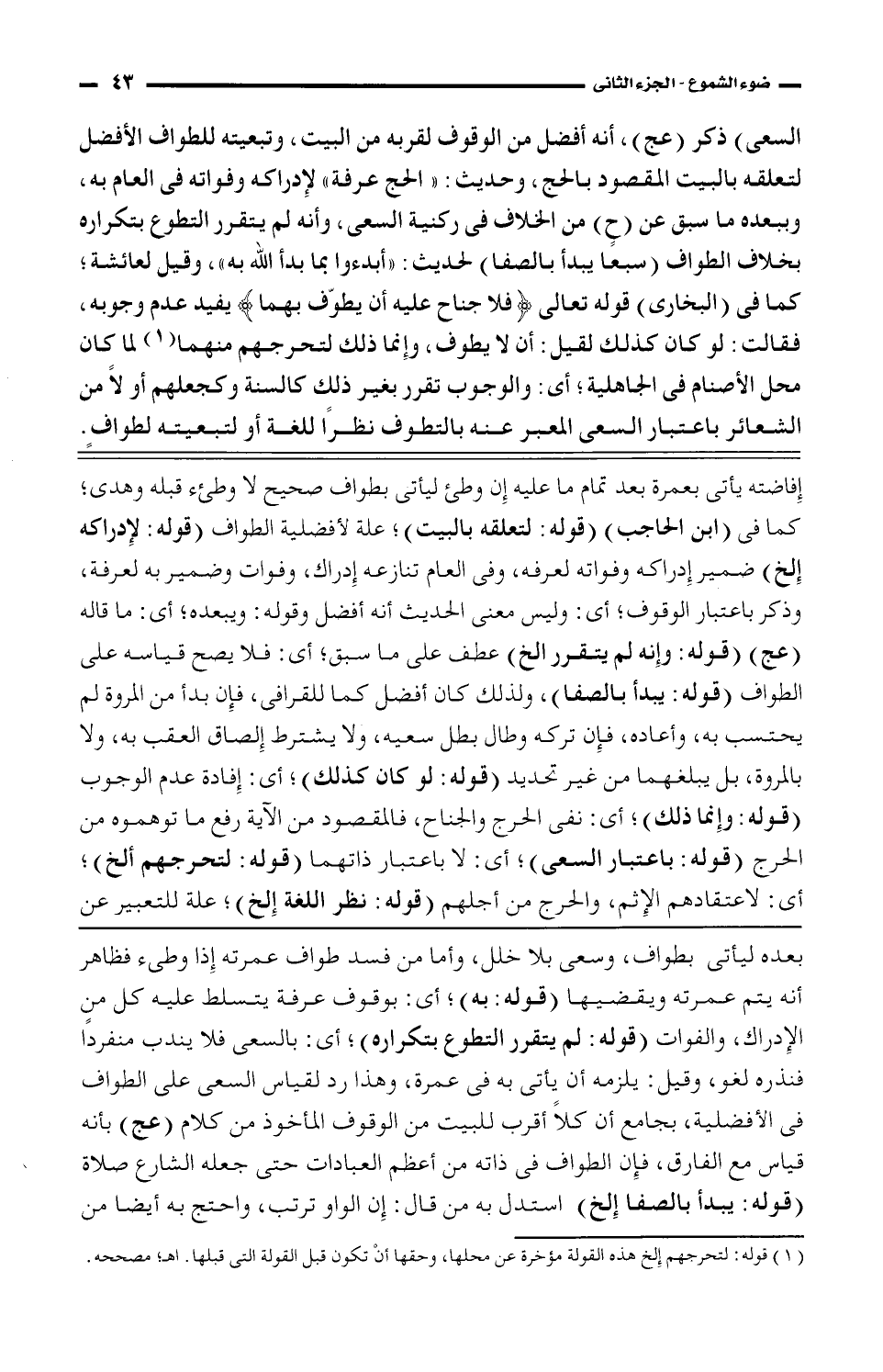 إفاضته يأتى بعمرة بعد تمام ما عليه إن وطئ ليأتى بطواف صحيح لا وطء قبله وهدى؛ كما فى (ابن الحاجب) (قوله: لتعلقه بالبيت)؛ علة لأفضلية الطواف (قوله: لإدراكه إلخ) ضمير إدراكه وفواته لعرفه، وفى العام تنازعه إدراك، وفوات وضمير به لعرفة، وذكر باعتبار الوقوف؛ أى: وليس معنى الحديث أنه أفضل وقوله: ويبعده؛ أى: ما قاله (عج) (قوله: وإنه لم يتقرر الخ) عطف على ما سبق؛ أى: فلا يصح قياسه على الطواف (قوله: يبدأ بالصفا)، ولذلك كان أفضل كما للقرافى، فإن بدأ من المروة لم يحتسب به، وأعاده، فإن تركه وطال بطل سعيه، ولا يشترط إلصاق العقب به، ولا بالمروة، بل يبلغهما من غير تحديد (قوله: لو كان كذلك)؛ أى: إفادة عدم الوجوب (قوله: وإنما ذلك)؛ أى: نفى الحرج والجناح، فالمقصود من الآية رفع ما توهموه من الحرج (قوله: باعتبار السعى)؛ أى: لا باعتبار ذاتهما (قوله: لتخرجهم ألخ)؛ أى: لاعتقادهم الإثم، والحرج من أجلهم (قوله: نظر اللغة إلخ)؛ علة للتعبير عن