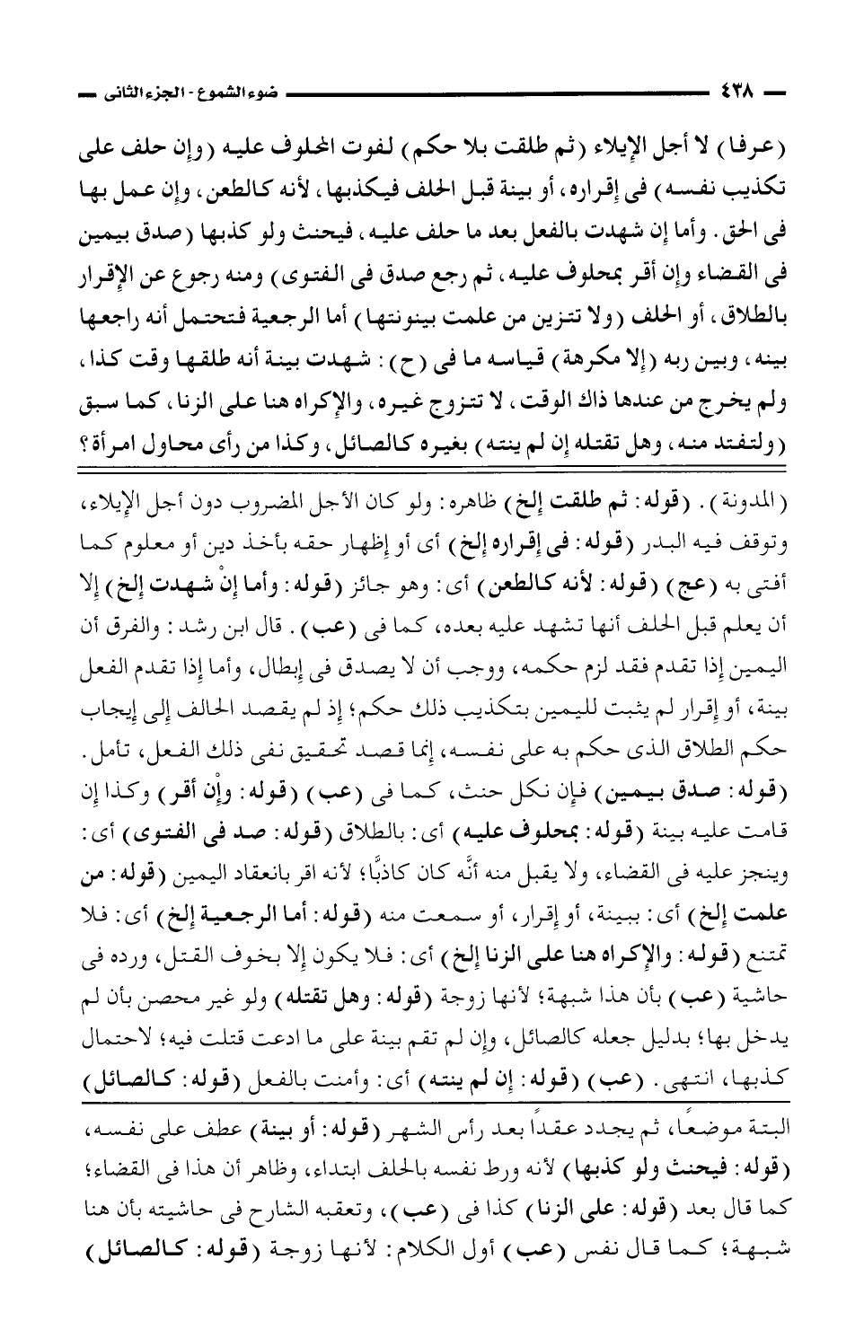(المدونة). (قوله: ثم طلقت إلخ) ظاهره: ولو كان الأجل المضروب دون أجل الإيلاء، وتوقف فيه البدر (قوله: في إقراره إلخ) أي أو إظهار حقه بأخذ دين أو معلوم كما أفتى به (عج) (قوله: لأنه كالطعن) أي: وهو جائز (قوله: وأما إن شهدت إلخ) إلا أن يعلم قبل الحلف أنها تشهد عليه بعده، كما في (عب). قال ابن رشد: والفرق أن اليمين إذا تقدم فقد لزم حكمه، ووجب أن لا يصدق في إبطال، وأما إذا تقدم الفعل بينه، أو إقرار لم يثبت لليمين بتكذيب ذلك حكم؛ إذ لم يقصد الحالف إلى إيجاب حكم الطلاق الذي حكم به على نفسه، إنما قصد تحقيق نفي ذلك الفعل، تأمل. (قوله: صدق بيمين) فإن نكل حنث، كما في (عب) (قوله: وإن أقر) وكذا إن قامت عليه بينة (قوله: بمحلوف عليه) أي: بالطلاق (قوله: صد في الفتوى) أي: وينجز عليه في القضاء، ولا يقبل منه أنَّه كان كاذبَّا؛ لأنه اقر بانعقاد اليمين (قوله: من علمت إلخ) أي: ببينة، أو إقرار، أو سمعت منه (قوله: أما الرجعية إلخ) أي: فلا تمتنع (قوله: والإكراه هنا على الزنا إلخ) أي: فلا يكون إلا بخوف القتل، ورده في حاشية (عب) بأن هذا شبهة؛ لأنها زوجة (قوله: وهل تقتله) ولو غير محصن بأن لم يدخل بها؛ بدليل جعل كالصائل، وإن لم تقم بنية على ما ادعت قتلت فيه؛ لاحتمال كذبها، انتهى. (عب) (قوله: إن لم ينته) أي: وأمنت بالفعل (قوله: كالصائل)