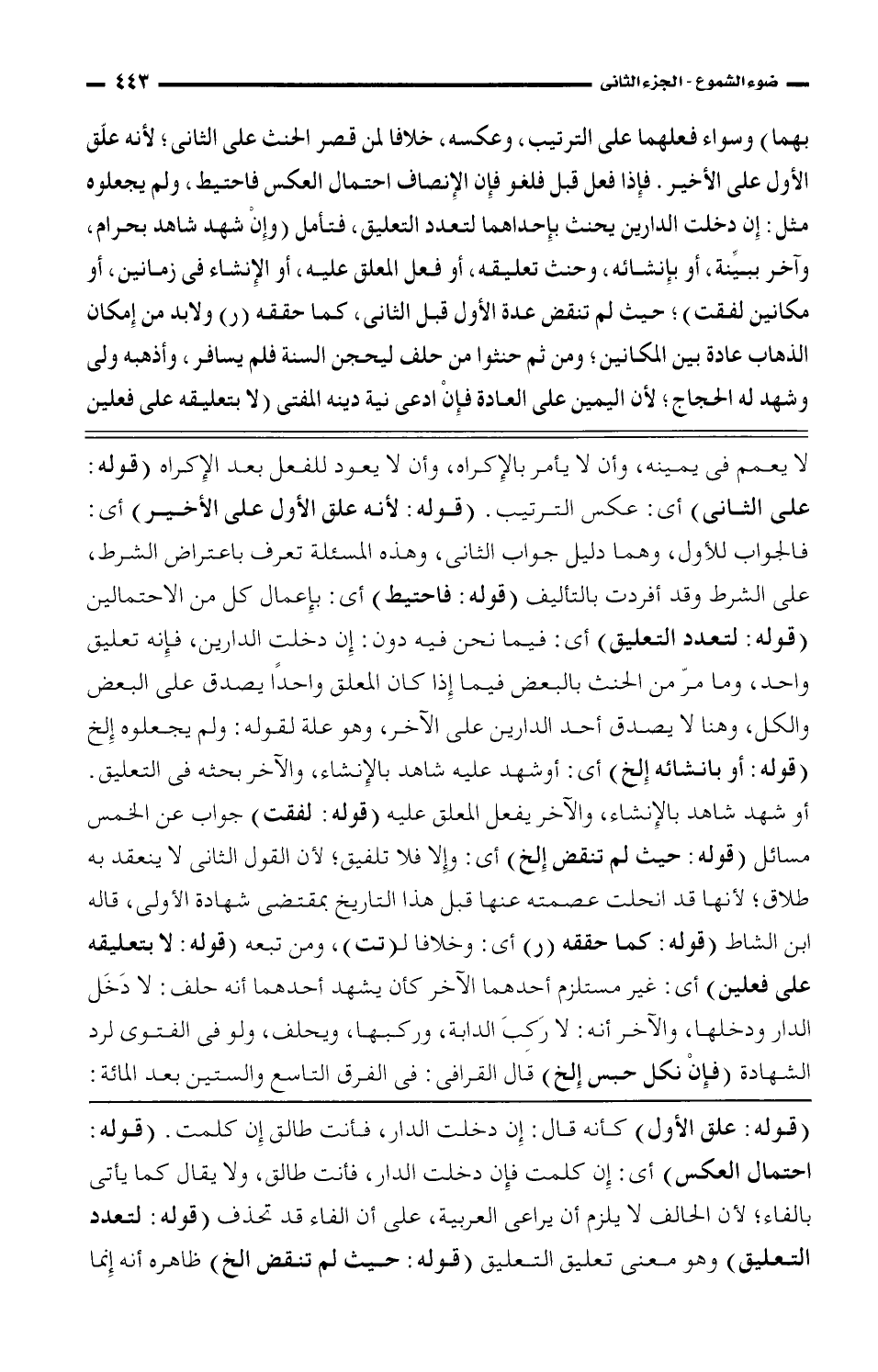 لا يعمم في يمينه، وأن لا يأمر بالإكراه، وأن لا يعود للفعل بعد الإكراه (قوله: على الثاني) أي: عكس الترتيب. (قوله: لأنه علق الأول على الأخير) أي: فالجواب الأول، وهما دليل جواب الثاني، وهذه المسئلة تعرف باعتراض الشرط، على الشرط وقد أفردت بالتأليف (قوله: فاحتيط) أي: بإعمال كل من الاحتمالين (قوله: لتعدد التعليق) أي: فيما نحن فيه دون: إن دخلت الدارين، فإنه تعليق واحد، وما مر من الحنث بالبعض فيما إذا كان المعلق واحدًا يصدق على البعض والكل، وهنا لا يصدق أحد الدارين على الآخر، وهو علقة لقوله: ولم يجعلوه إلخ (قوله: أو بإنشائه إلخ) أي: أو شهد عليه شاهد بالإنشاء، والآخر بحثه في التعليق. أو شهد شاهد بالإنشاء، والآخر يفعل المعلق عليه (قوله: لفقت) جواب عن الخمس مسائل (قوله: حيث لم تقض إلخ) أي: وإلا فلا تلفيق؛ لأن القول الثاني لا ينعقد به طلاق؛ لأنها قد انحلت عصمته عنها قبل هذا التاريخ بمقتضى شهادة الأولى، قال ابن الشاط (قوله: كما حققه (ر) أي: وخلافاً لـ (تت)، ومن تبعه (قوله: لا بتعليقه على فعلين) أي: غير مستلزم أحدهما الآخر كأن يشهد أحداهما أنه حلف: لا دخل الدار ودخلها، والآخر أنه: لا ركب الدابة، وركبها، ويحلف، ولو في الفتوى لرد الشهادة (فإن نكل حبس إلخ) قال القرافي: في الفرق التاسع والستين بعد المائة: