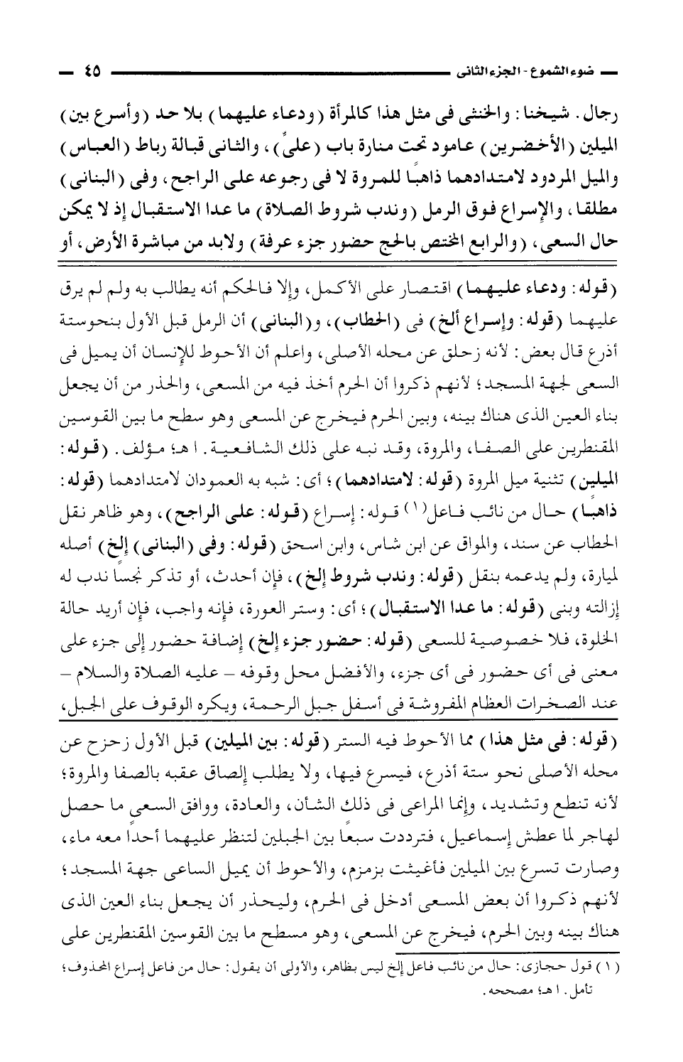 رجال. شيخنا: والخنثى فى مثل هذا كالمرأة (ودعاء عليهما) بلا حد (وأسرع بين الميلين (الأخضرين) عامود تحت منارة باب (على)، والثانى قبالة رباط (العباس) والميل المردود لامتدادهما ذاهبًا للمروة لا فى رجوعه على الراجح، وفى (البنانى) مطلقا، والإسراع فوق الرمل (وندب شروط الصلاة) ما عدا الاستقبال إذ لا يمكن حال السعى، (والرابع المختص بالحج حضور جزء عرفة) ولابد من مباشرة الأرض، أو